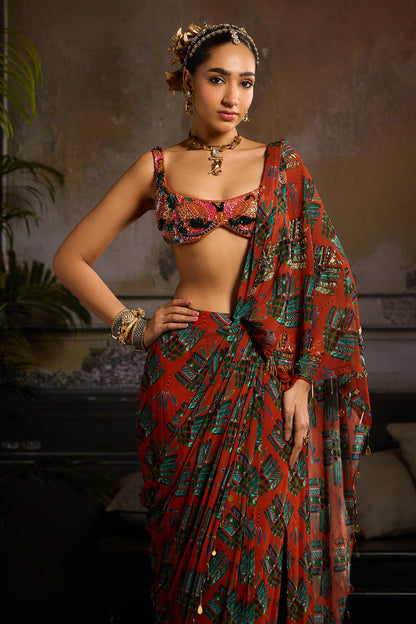 Rust Embellished Blouse with Butta Leaf Print and Highlighted Draped Slit Skirt Saree