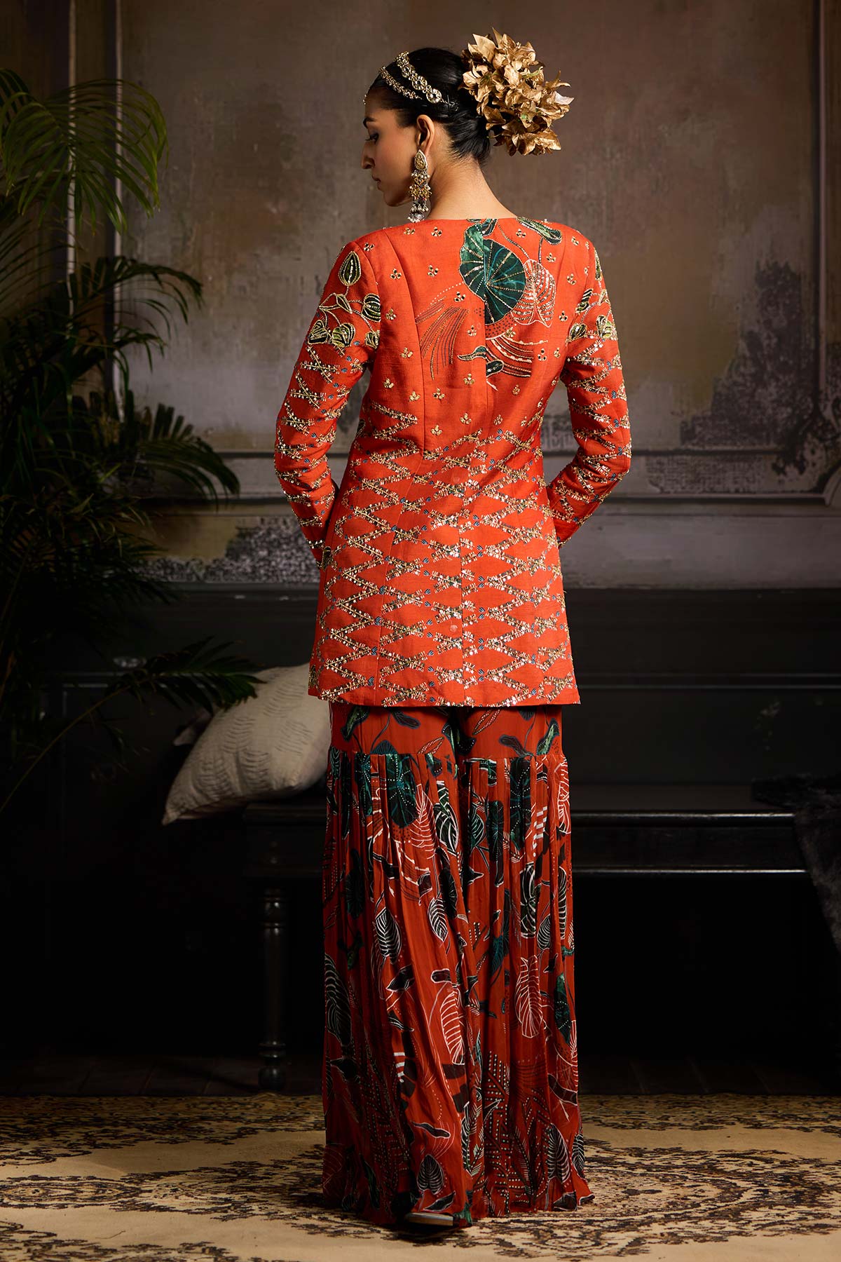 Rust Leaf Print and Highlighted Jacket with Gharara Pants