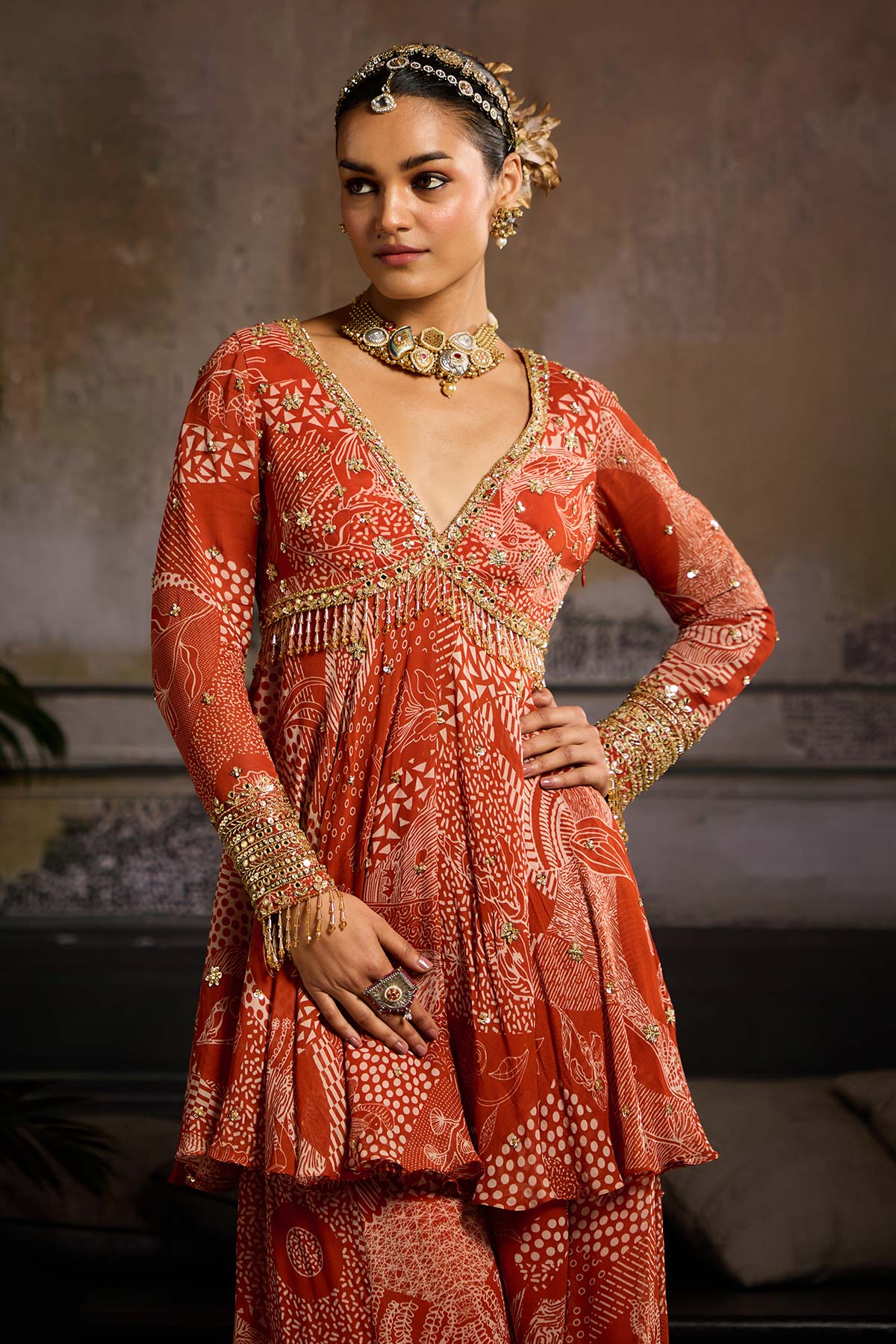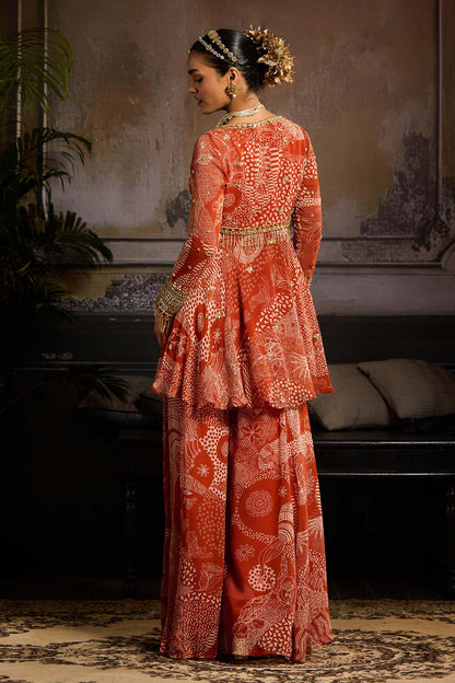 Rust Abstract Jaal Print and Highlighted Peplum Kurti with Rust Abstract Jaal Printed Sharara