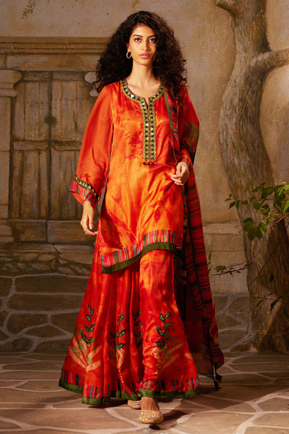 Make a Statement with Our Rust Sharara Set, Adorned with Embelishment and Printed Organza Dupatta, Perfect for Your Haldi Occasion