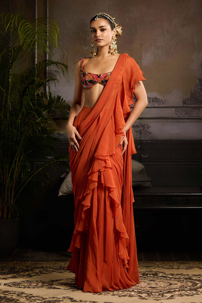 Rust Embellished Blouse with Frill Draped Skirt Saree