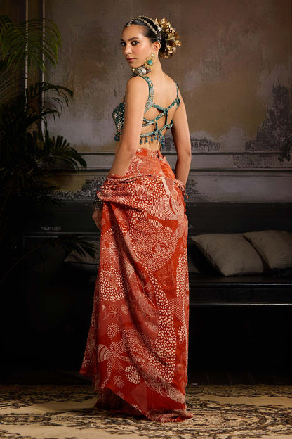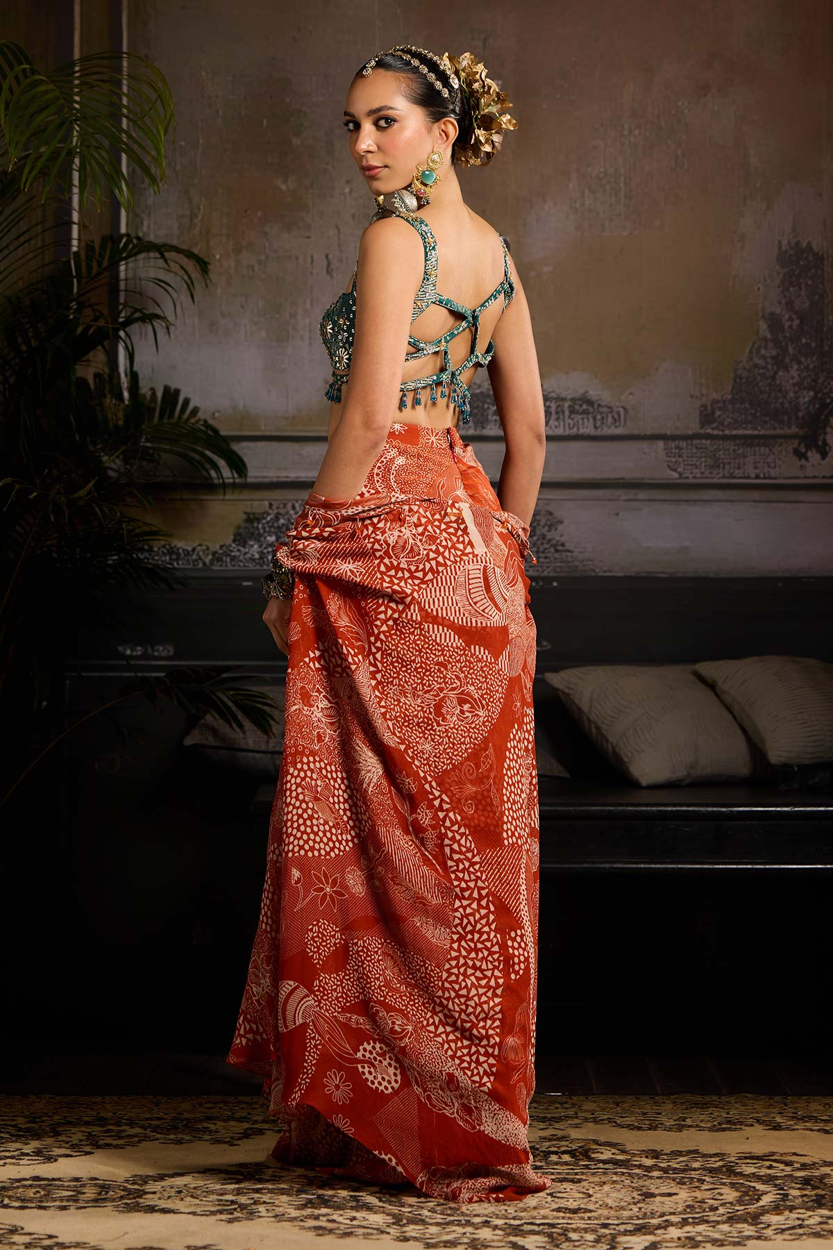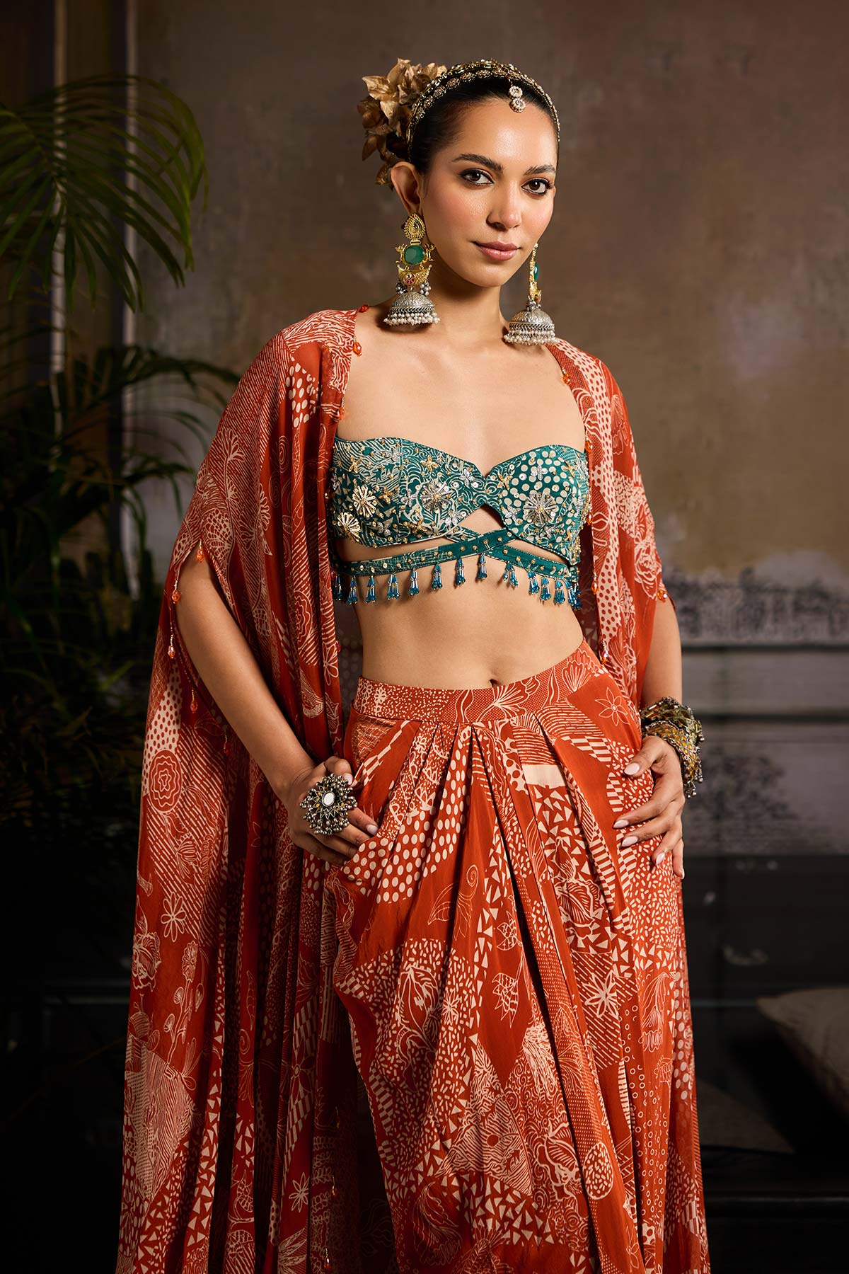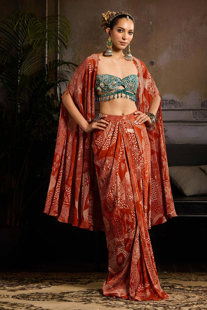 Teal Abstract Jaal Print and Highlighted Blouse with Rust Abstract Jaal Printed Drape Skirt and Rust Abstract Jaal Printed Cape