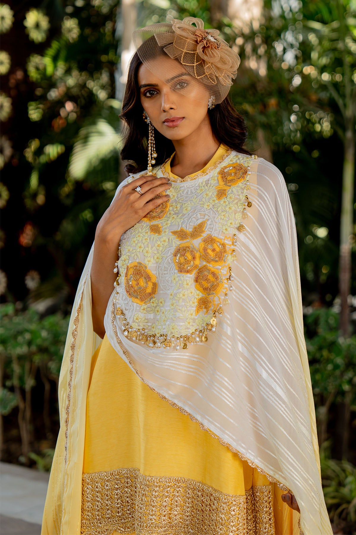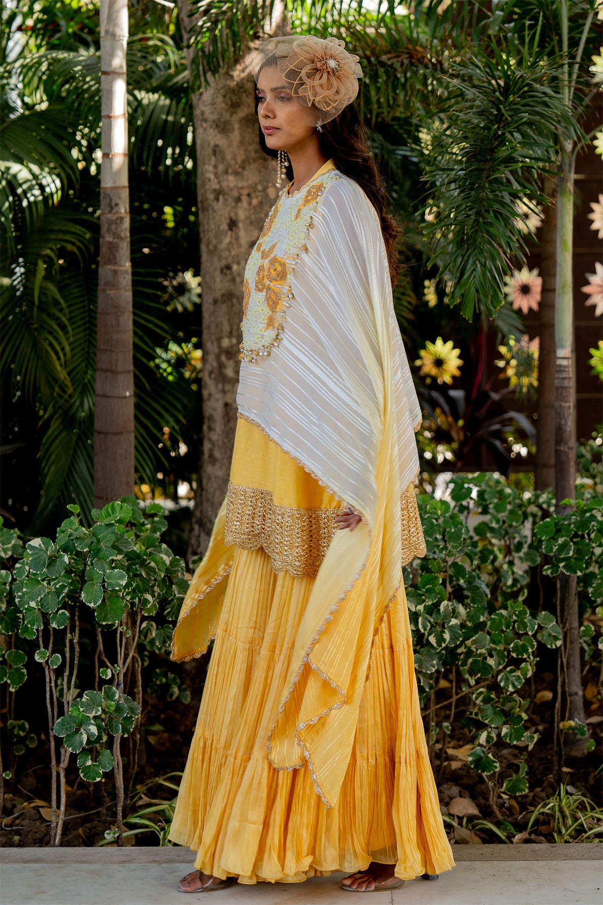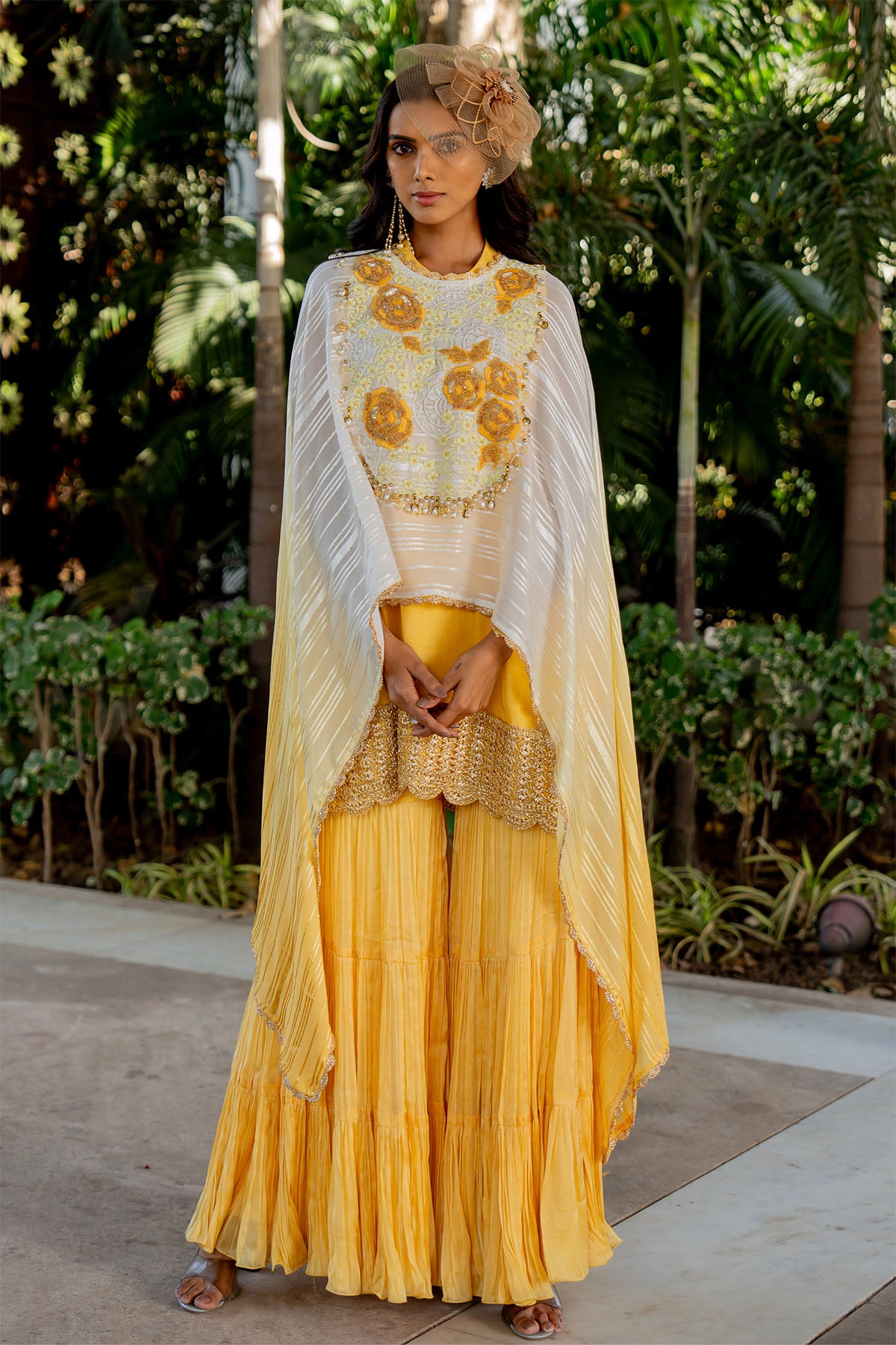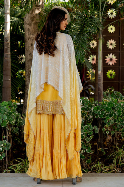 A flowy cape with an embroidered yoke and tasselling matched with a flared garara and a halter kurti with mesh at the hem