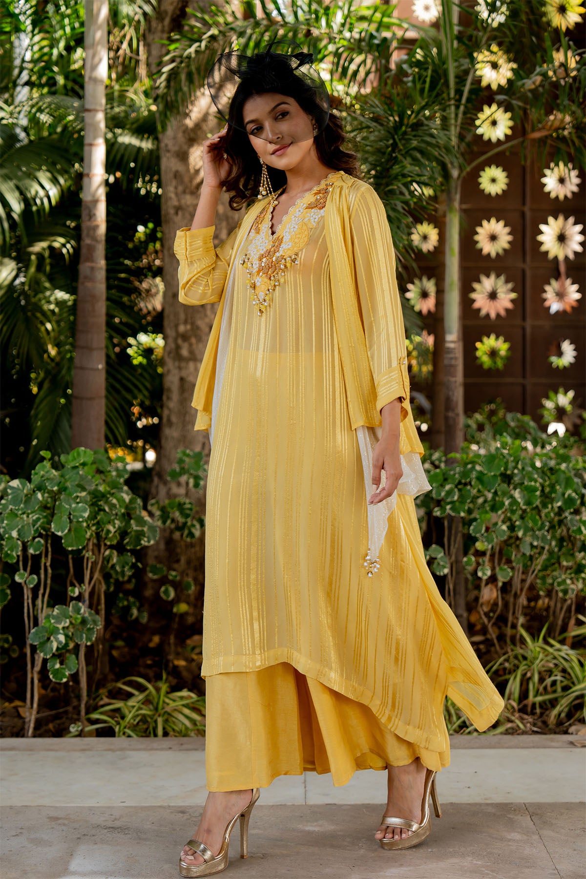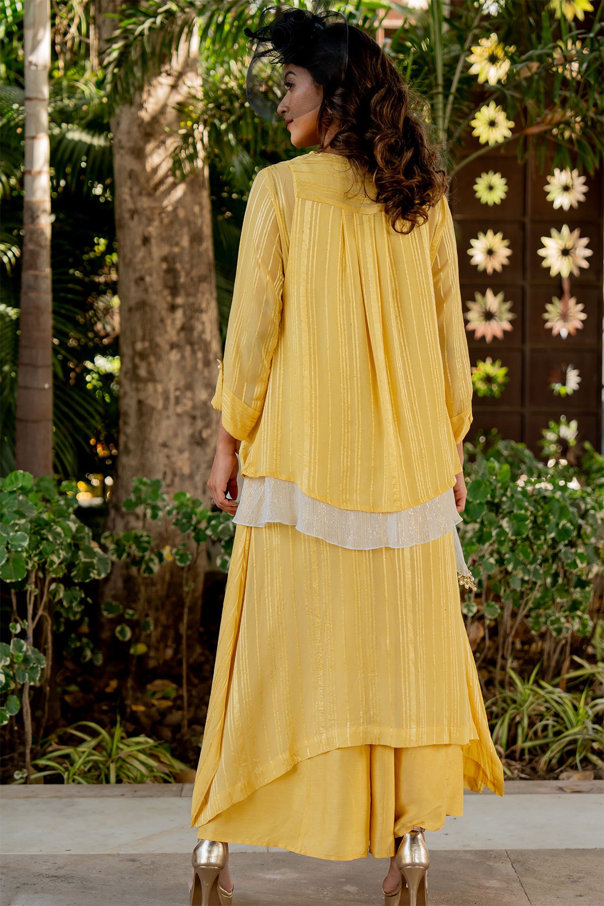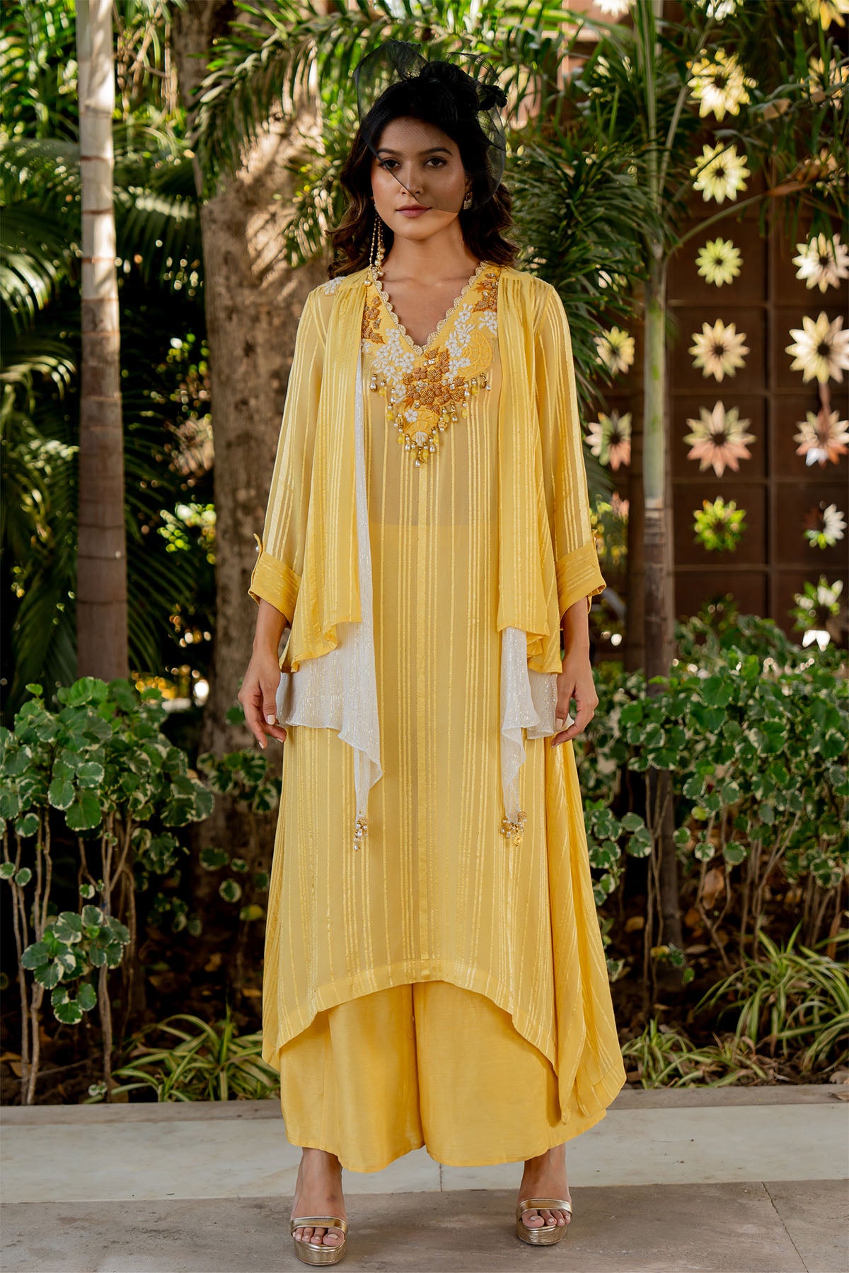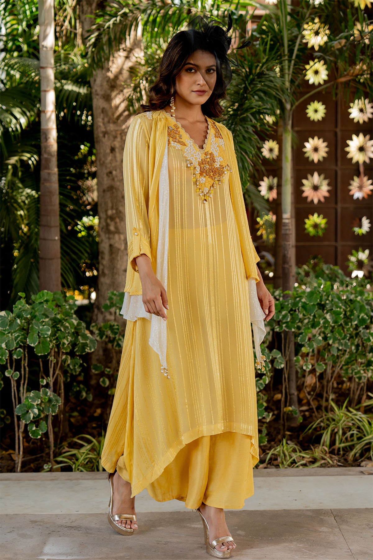 2 layered cape and a handkerchief top with an embroidered yoke paired with a flared pant