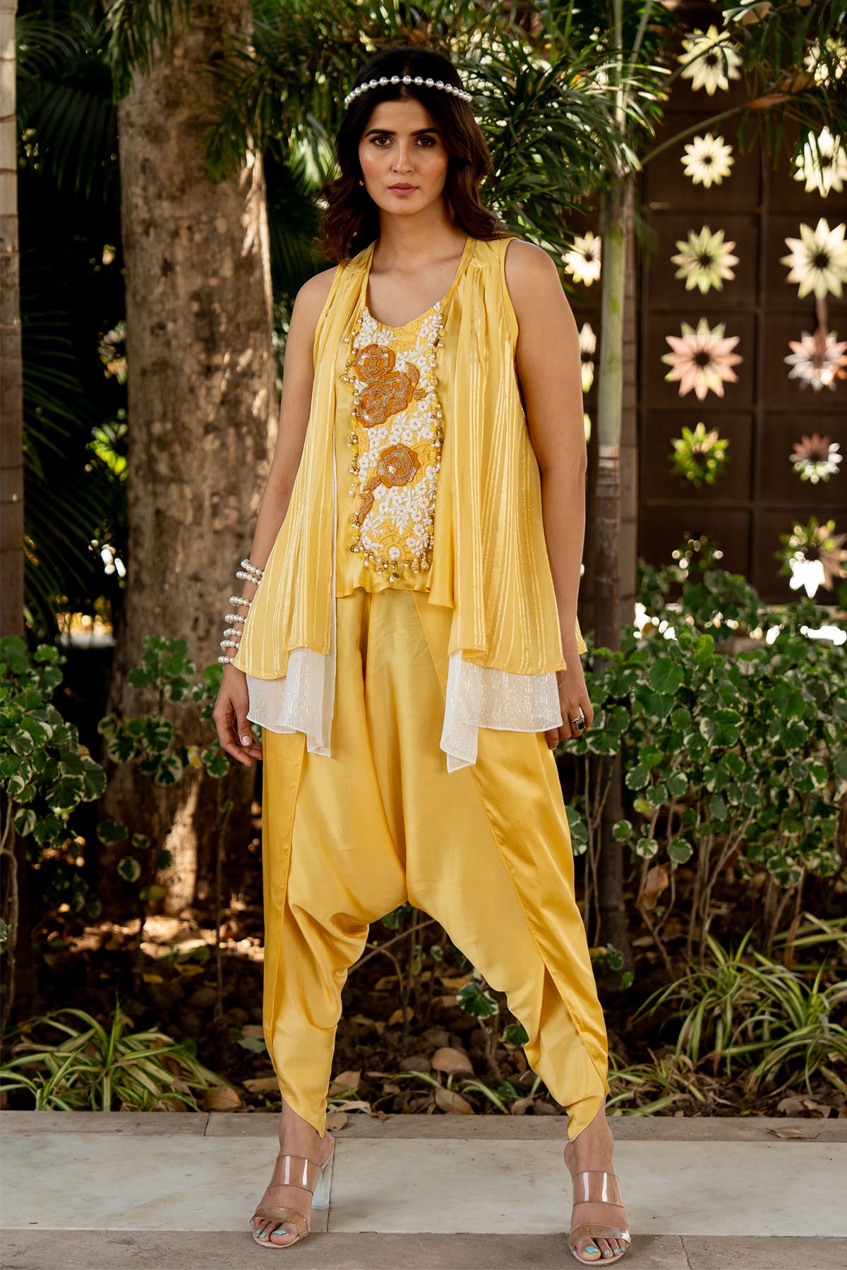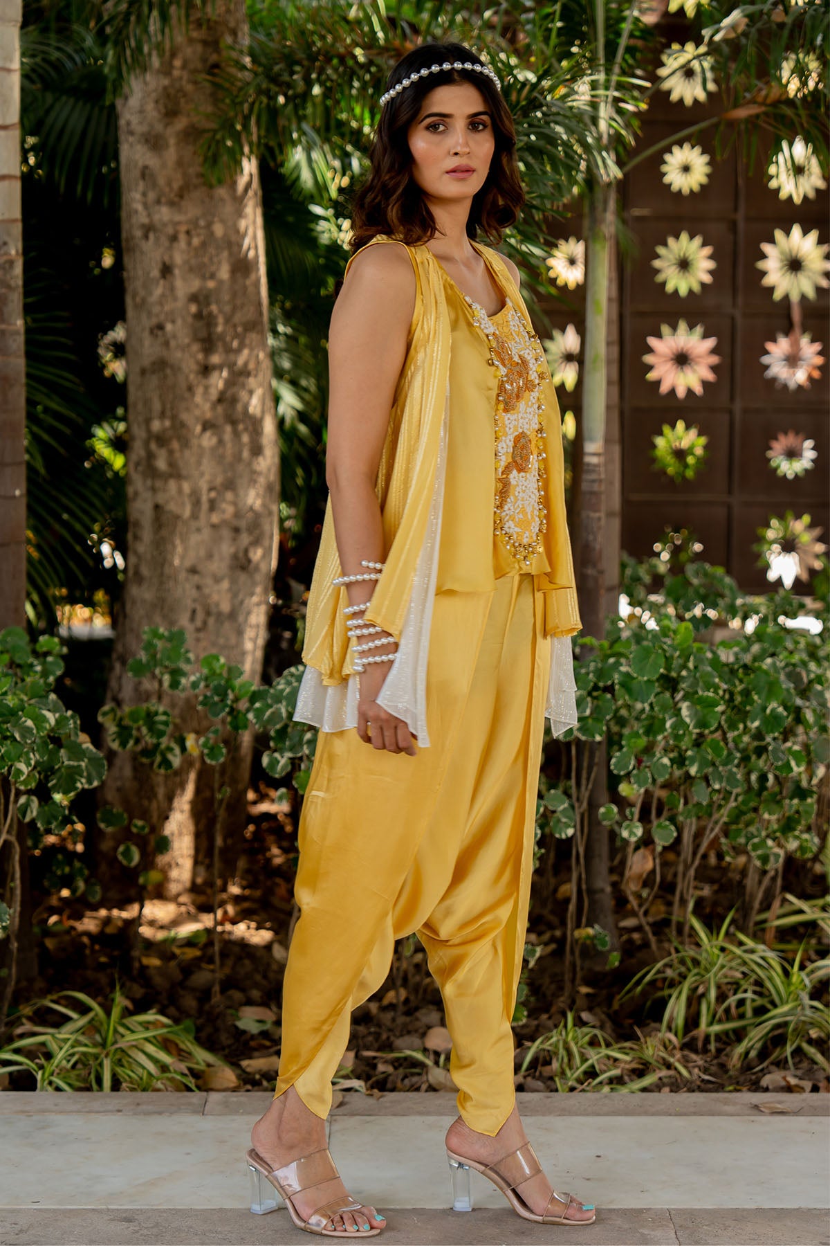 A two-layered cape worn with a dhoti and a peplum featuring an embroidered yoke and tasselling
