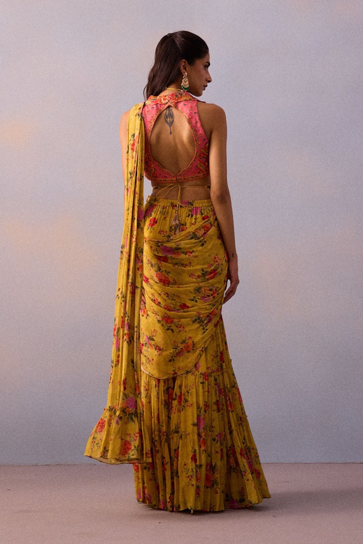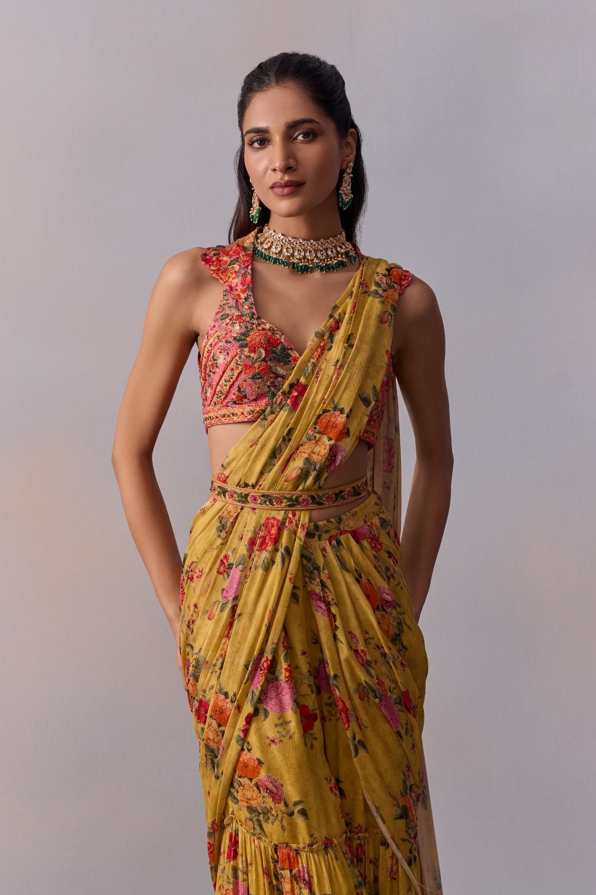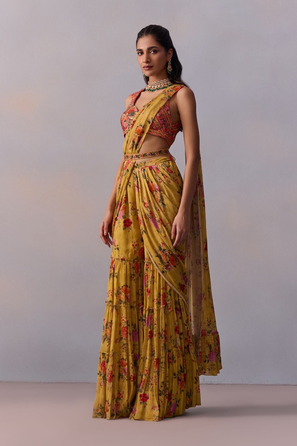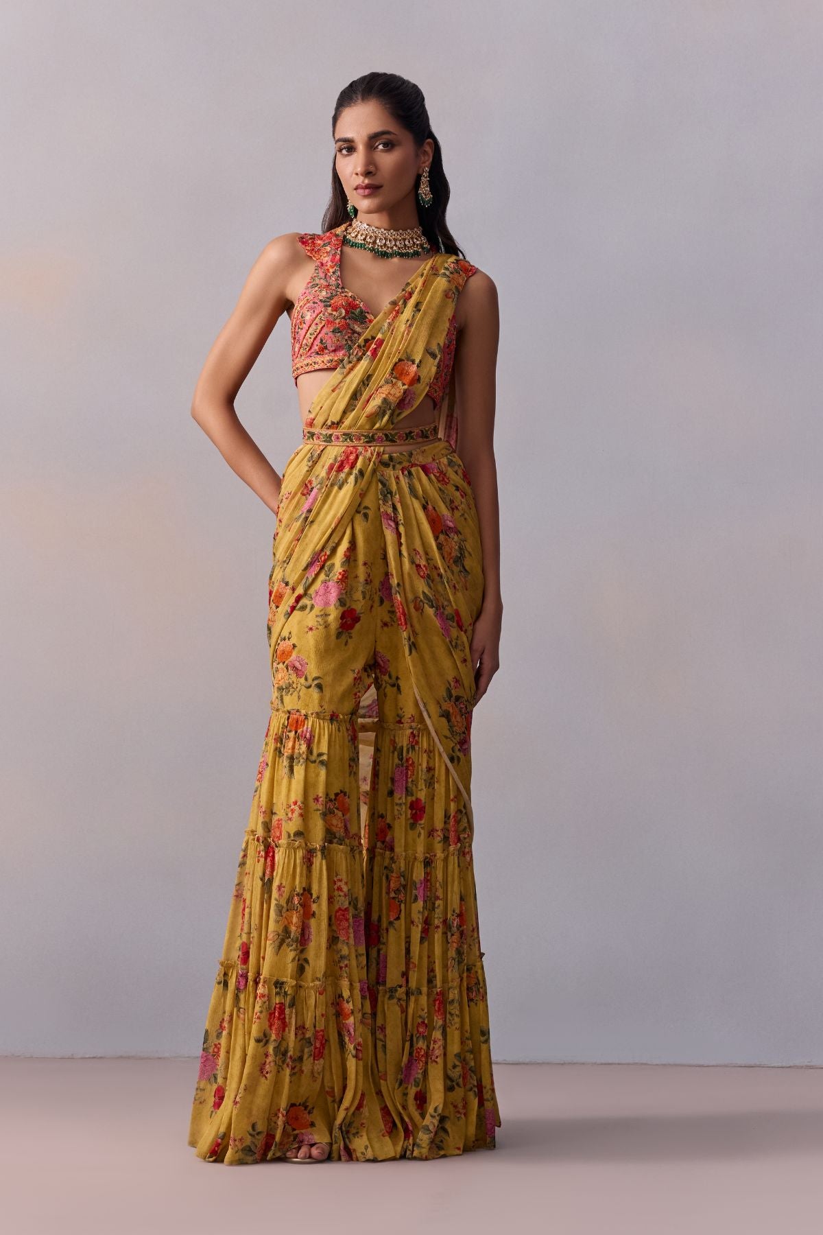 Featuring a comtemporary interplay of pre-draped Saree with Gharara pants in our soft floral print styled with a meticulously intricate hand-embroidered collared blouse. The Saree is adorned with an intricately embroidered waistline . Perfect for your festive and glamorous occassion wear.