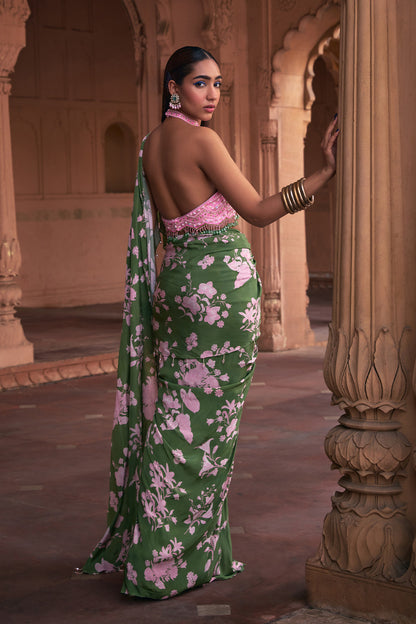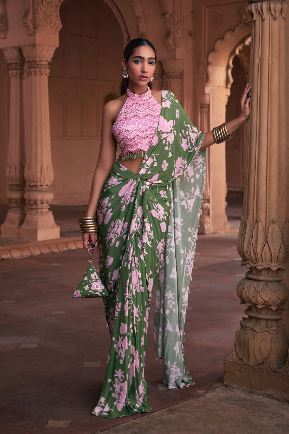SAGE GREEN FLORAL PRINT & HIGHLIGHTED SAREE SET