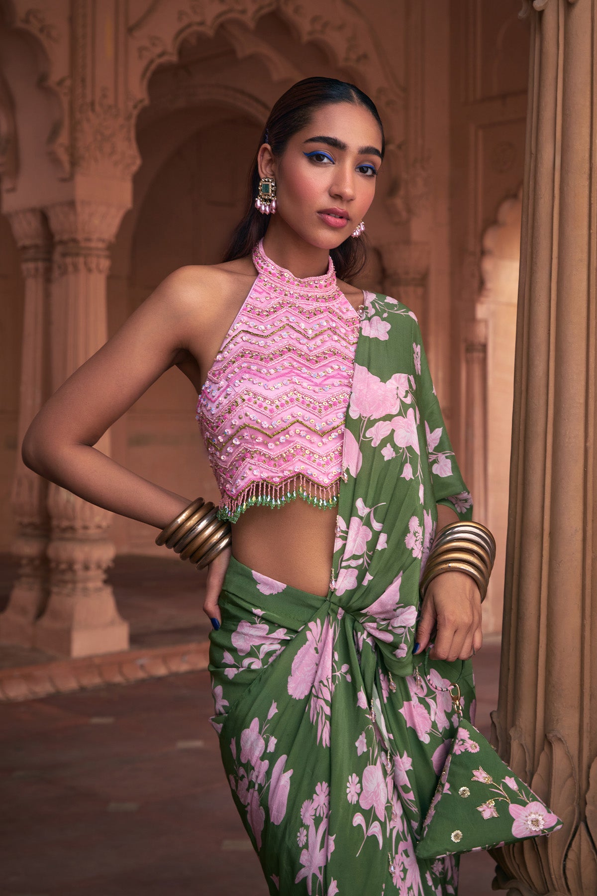 Blush pink chevron embroidered halter neck blouse with sage green skirt saree & triangle bag