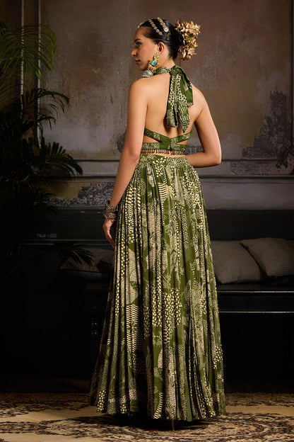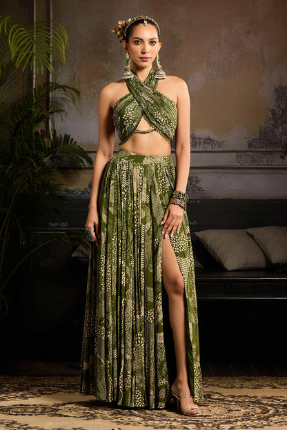 Sage Green Abstract Jaal Ruched Print and Highlighted Blouse with Sage Green Abstract Jaal Printed Slit Skirt