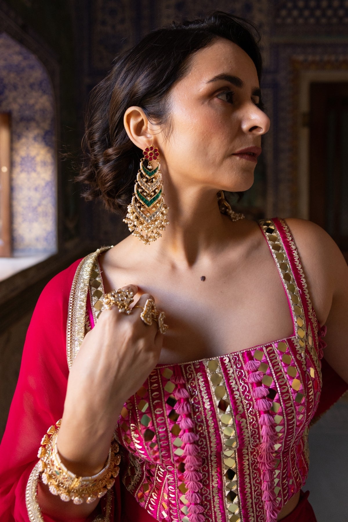 Description: A vibrant expression of festive elegance, this ensemble features a pink blouse intricately hand embroidered with resham, sequins, and mirror work, creating a rich and luminous surface with beautiful artisanal detailing. The soft pink tones contrast strikingly with the bold base, making the blouse a true statement piece. The blouse is paired with a solid shaded pink red lehenga, offering a classic and graceful silhouette that balances the ornate embroidery. Completing the look is a solid red dupatta, finished with a fringe lace edge that adds movement and a touch of contemporary charm. Perfect for weddings, festive celebrations, and special occasions, this ensemble blends traditional craftsmanship with timeless color play.