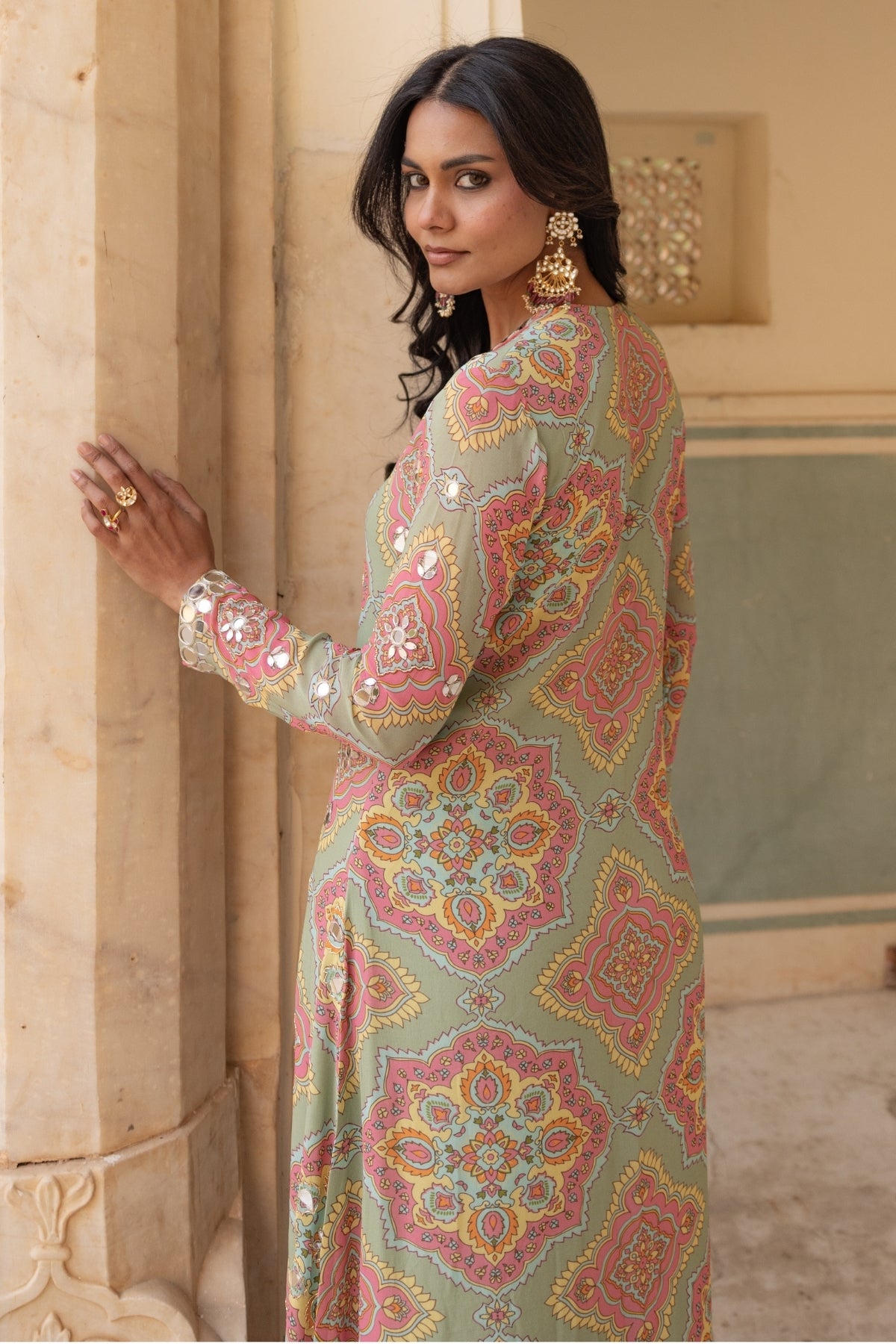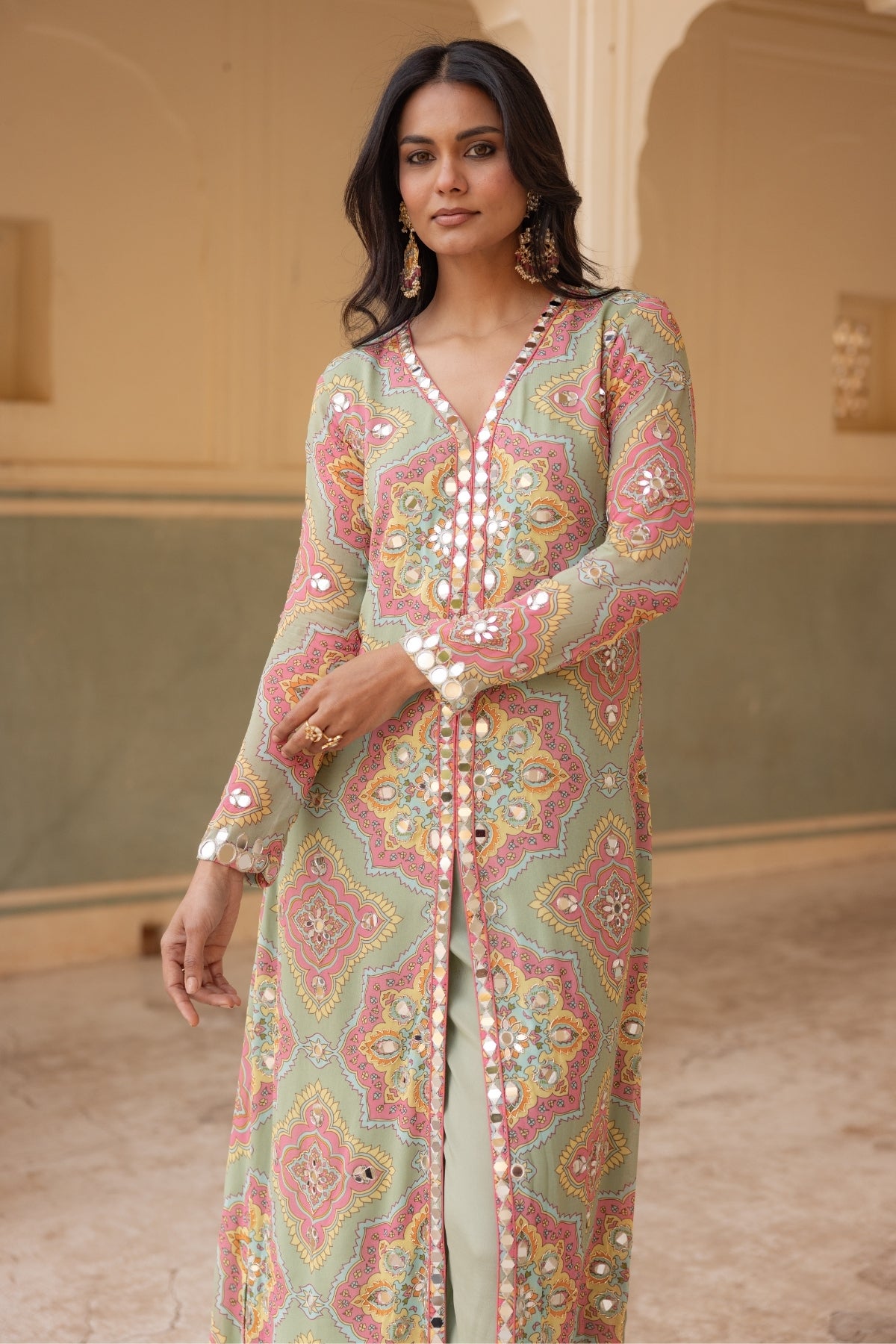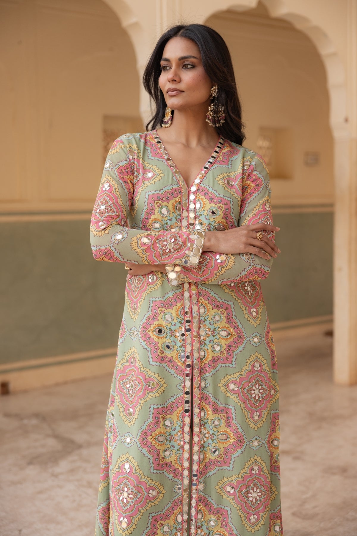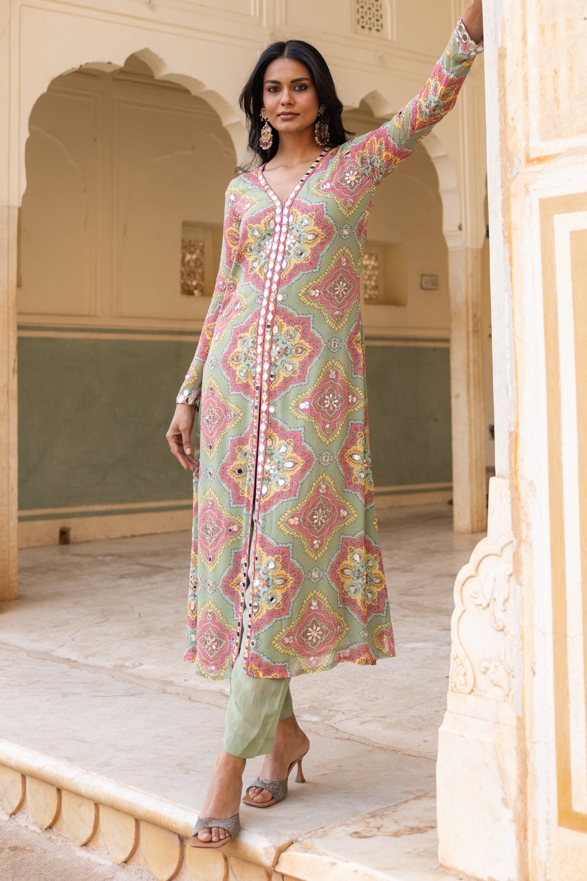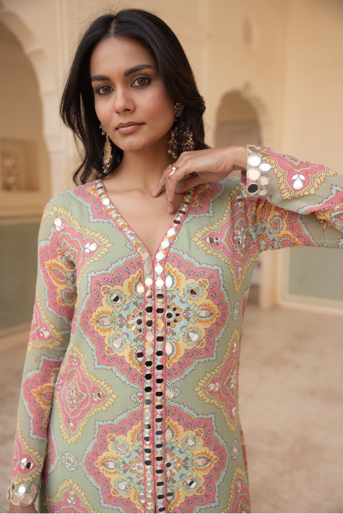 Description: A perfect blend of tradition and contemporary style, this printed long kurta is elevated with all-over hand-embroidered mirror work, adding subtle sparkle and artisanal charm. The intricate mirror detailing enhances the print beautifully, creating a refined yet eye-catching look. Paired with coordinated solid straight-cut pants, the ensemble offers a balanced silhouette that is both comfortable and effortlessly stylish. Ideal for festive gatherings, daytime celebrations, and elegant soirées, this set is versatile and timeless.
