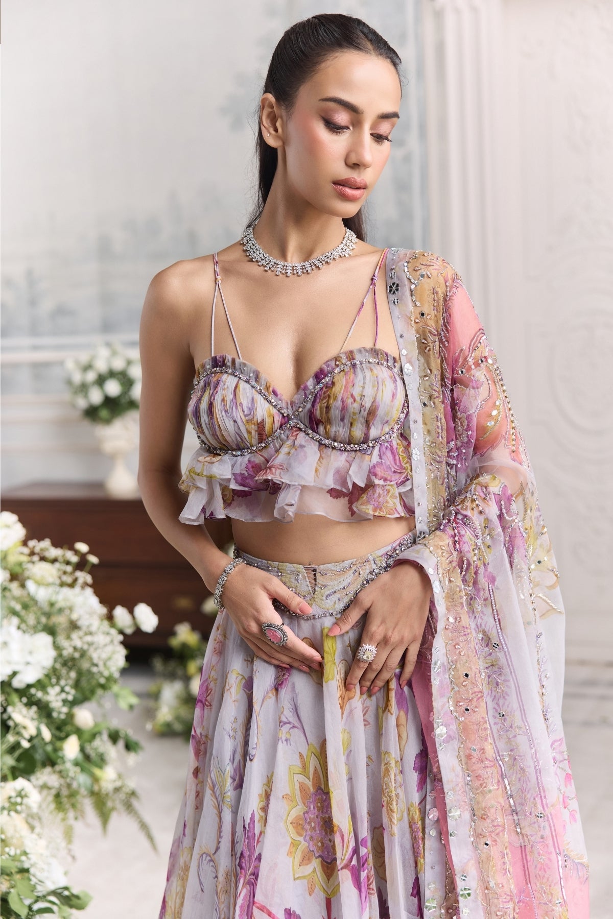 Ruffled Bustier Peplum Top Paired With Heavy Chunni And Floral Lehenga