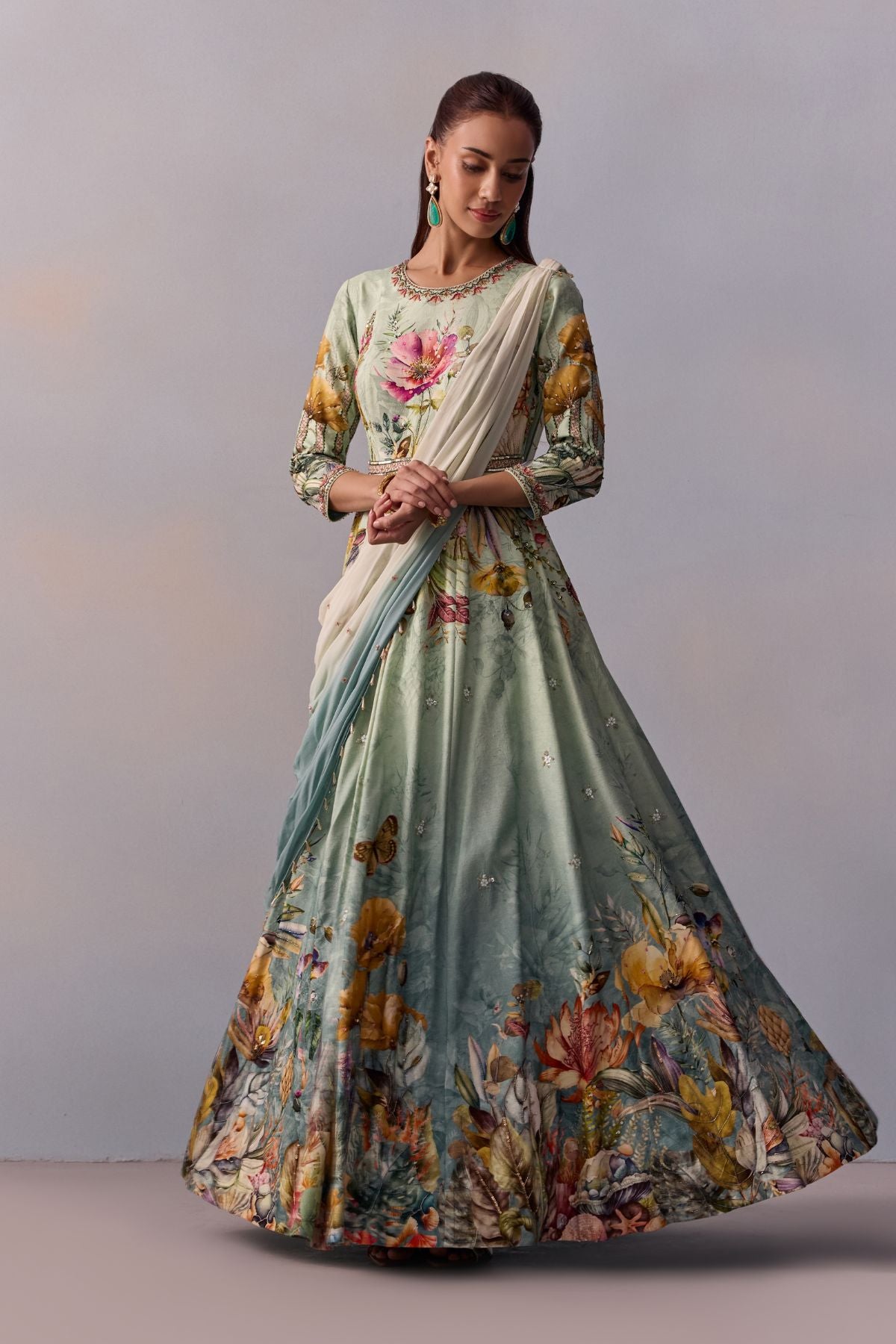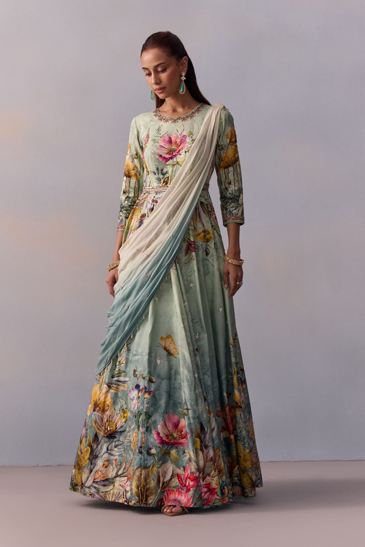Featuting A Tropical Floral design gown anarkali beautifully adorned with intricate hand embroidery on the yoke and border of the outfit. The Outfit Is paired with a coordinated Pre-Draped Dupatta. Perfect Outfit To Ace That Contemporaray Indian Look.