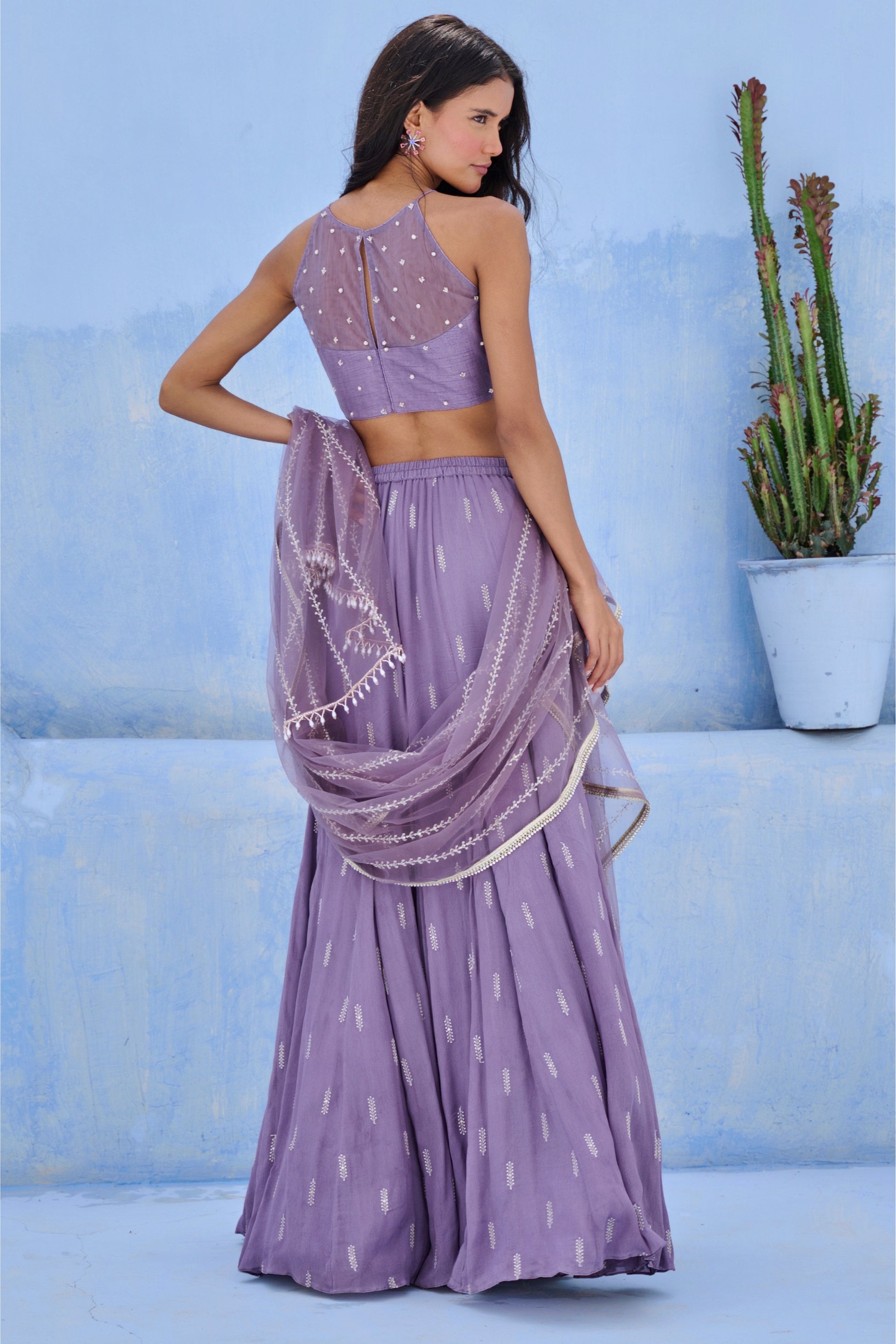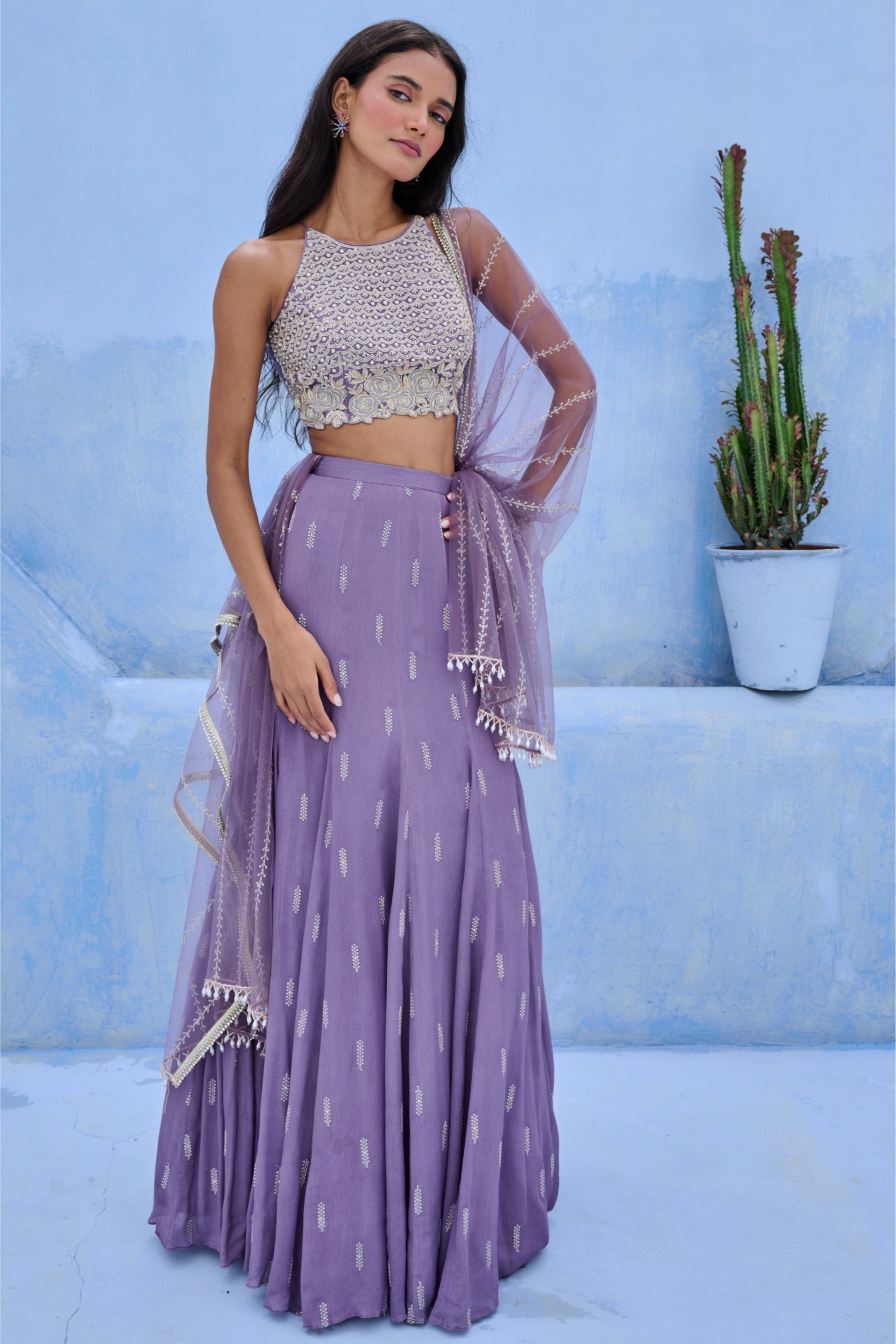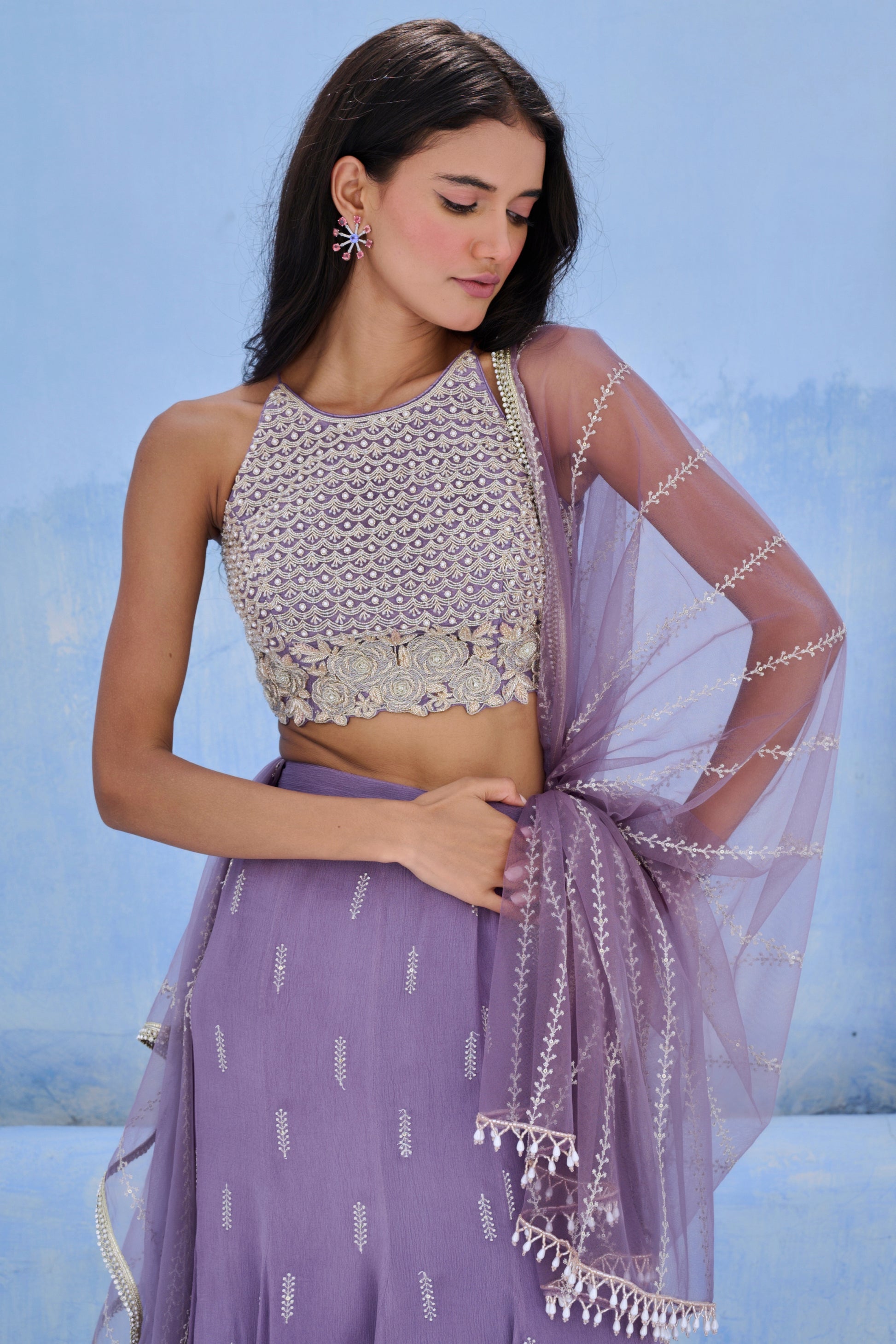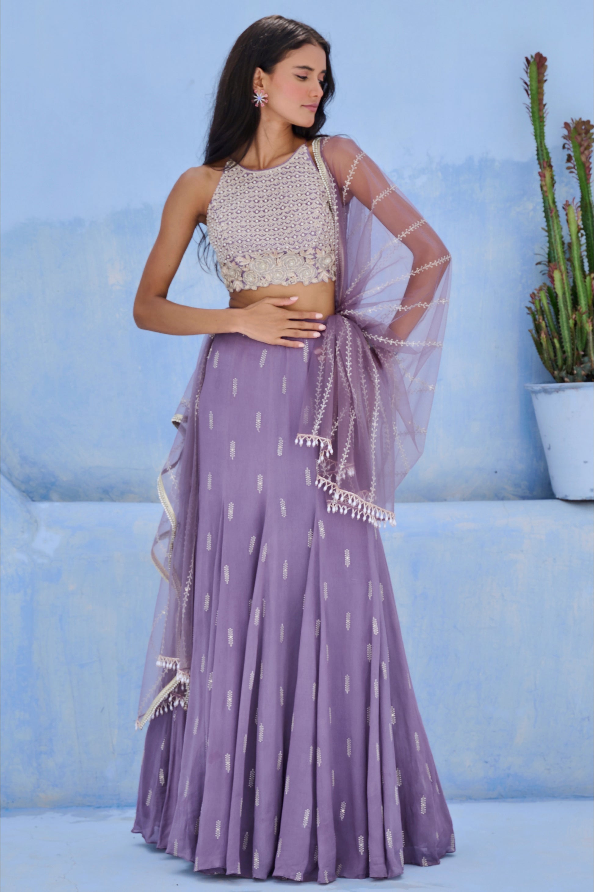 Sequence embellished gusset skirt paired with glassbeads and pearl embroidered halter neck blouse and embellished tulle dupatta