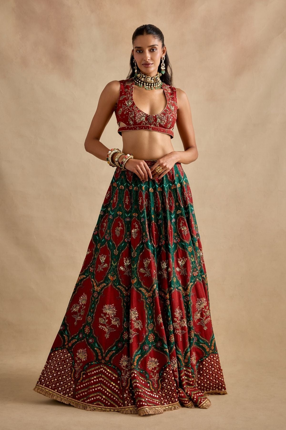 Shazia Lehenga Set Is A Stunning Piece Crafted In Multi-coloured Festive Colours Printed And Embroidered Silk, Featuring Heavy Tassel Strings With Gota Embroidery, Hand Adda Work, And Beads/sequins.detailing In Blouse Silhoutte With Front Opening And Key Hole Make Its More Unique.intericate Hand Embroidery Blouse. The Bold Colors Of Green , Maroon And Musturd Add A Vibrant Touch To This One-of-a-kind Set.