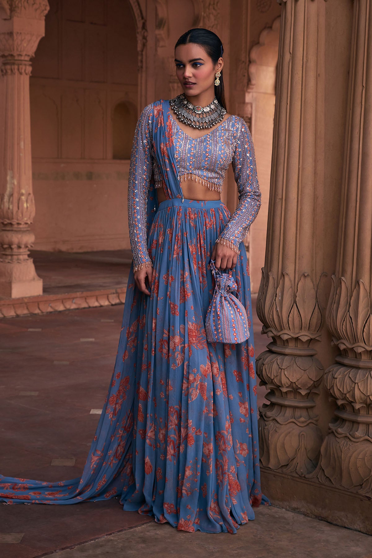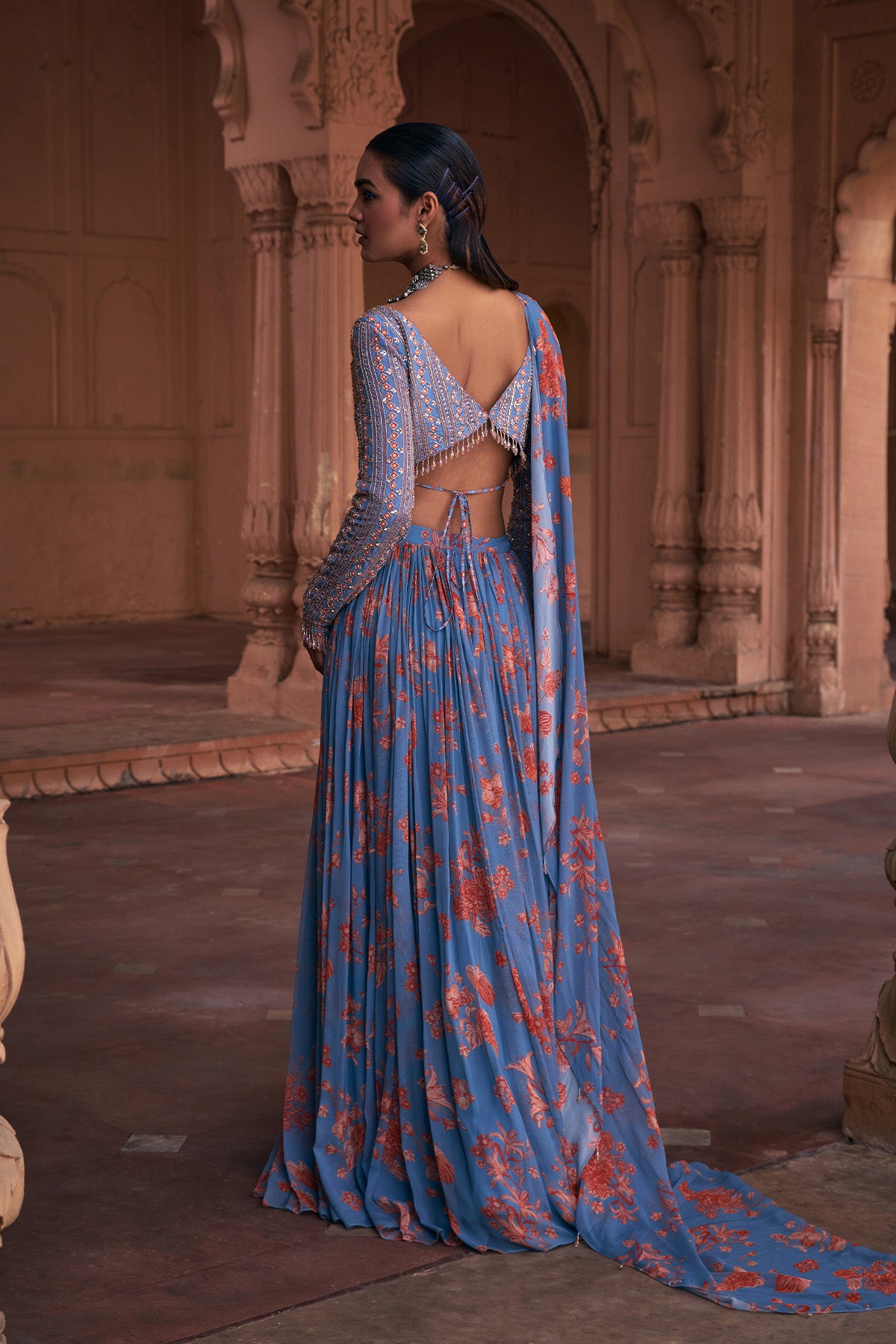 SLATE BLUE FLORAL PRINT & HIGHLIGHTED SAREE SET