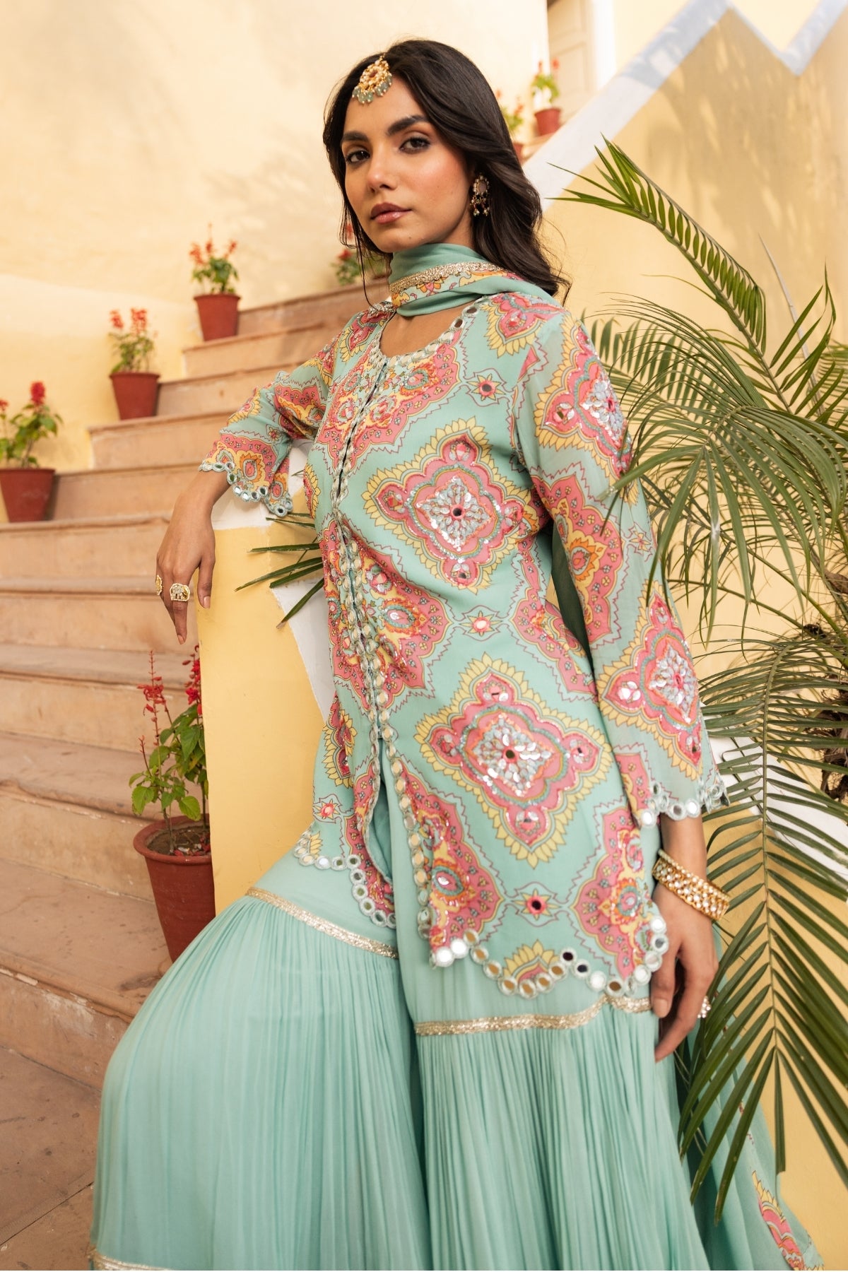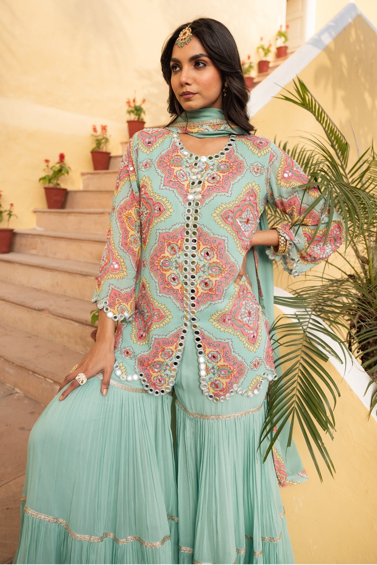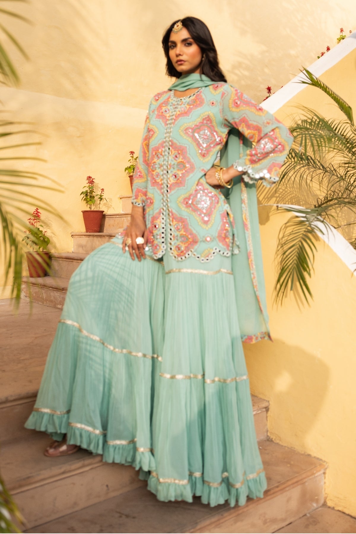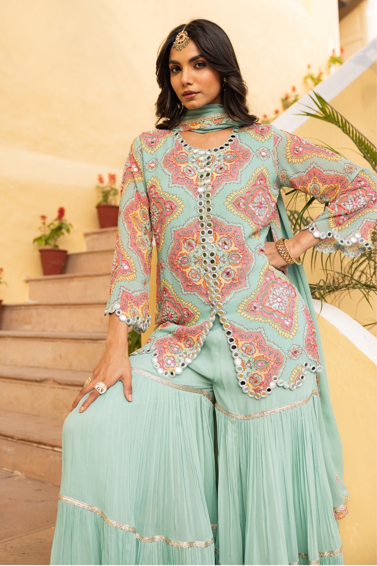 Description: Effortlessly chic and festive-ready, this ensemble features a printed georgette short kurta adorned with hand-embroidered mirror detailing along the neckline and edges, complemented by scattered mirror embroidery all over for subtle sparkle and artisanal charm. The kurta is paired with solid flared georgette sharara pants, finished with a lace edge for graceful movement and added elegance. Completing the look is a solid georgette dupatta with a printed border, perfectly tying together the playful prints and refined handwork. Ideal for festive occasions, daytime celebrations, and stylish gatherings, this set balances contemporary style with traditional craftsmanship.