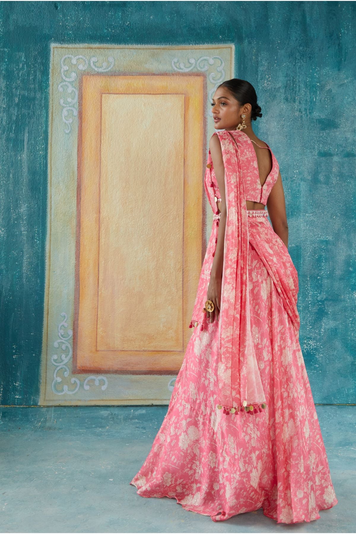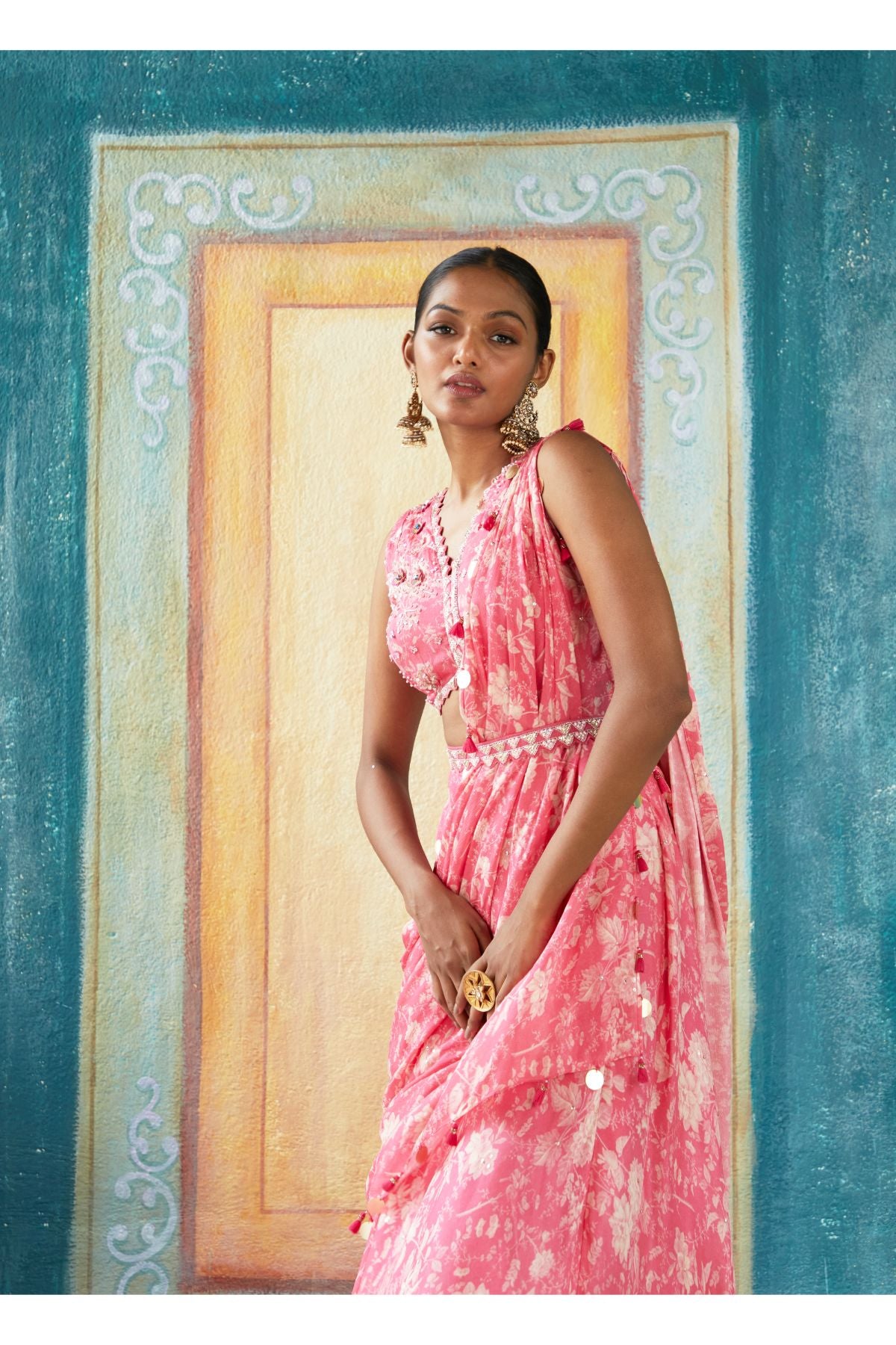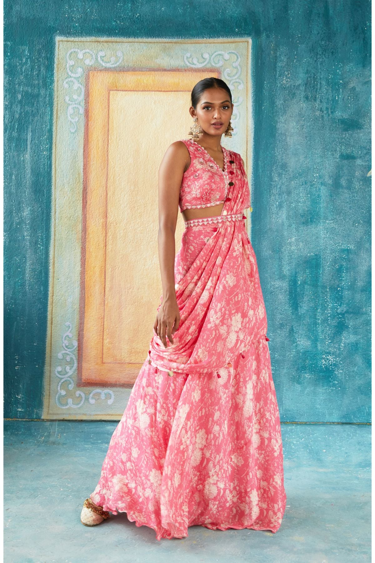 Pink Printed Draped Saree With Hand Embroidery V Neckline, Soft Easy Flowing Saree And Embroidery Saree Belt
