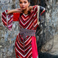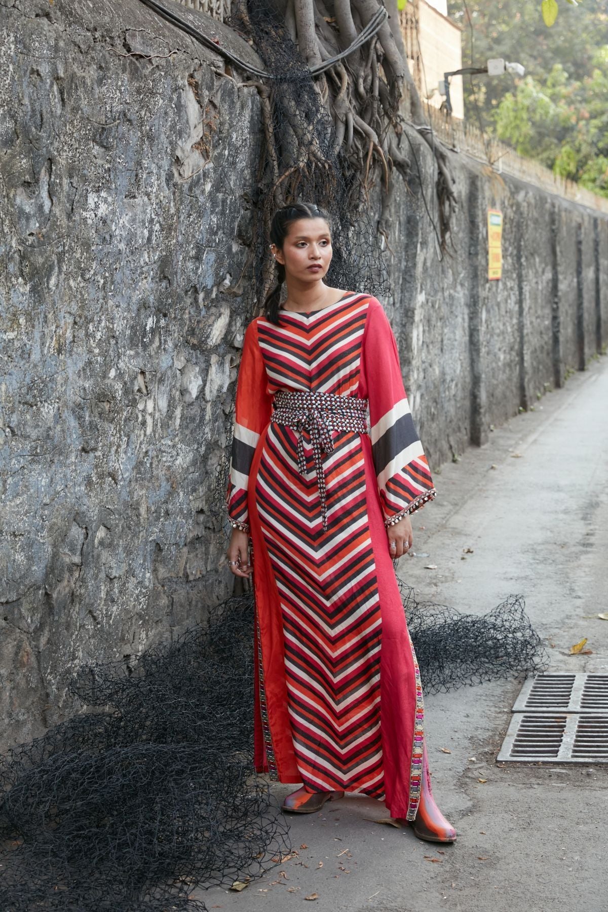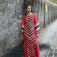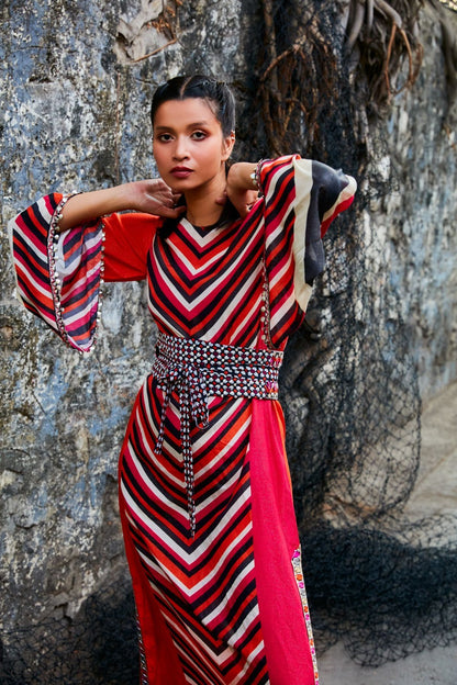 Color Block Graphic Print column Dress With Flared Sleeves Teamed With An Embellished Obi Belt