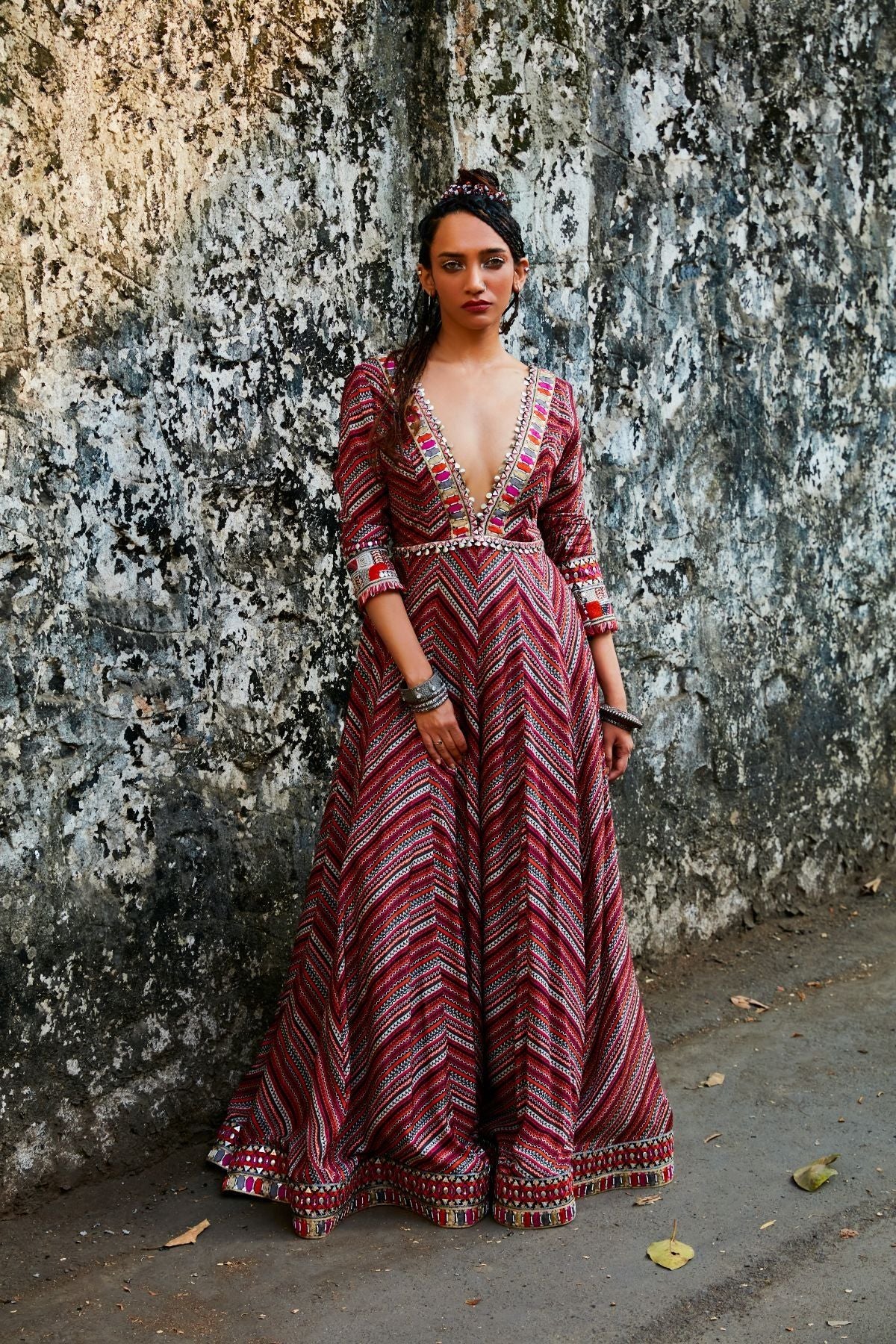 Bohemian Stripe Print Plunge Neck Anarkali