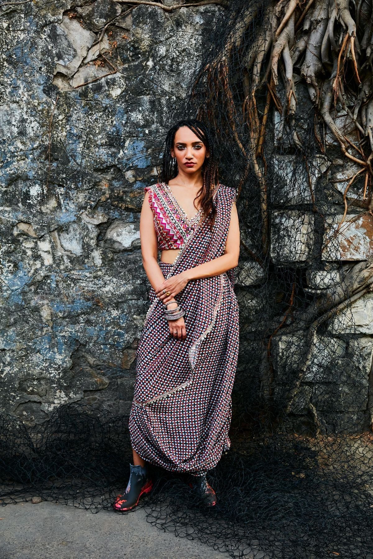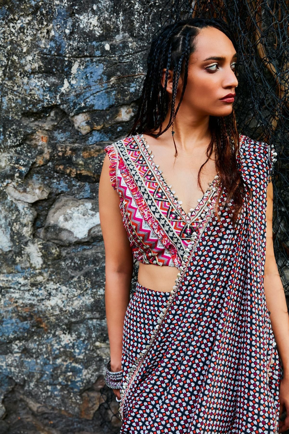 Embellished Crop Top Teamed With Black Geometric Drape Skirt With Attached Drape