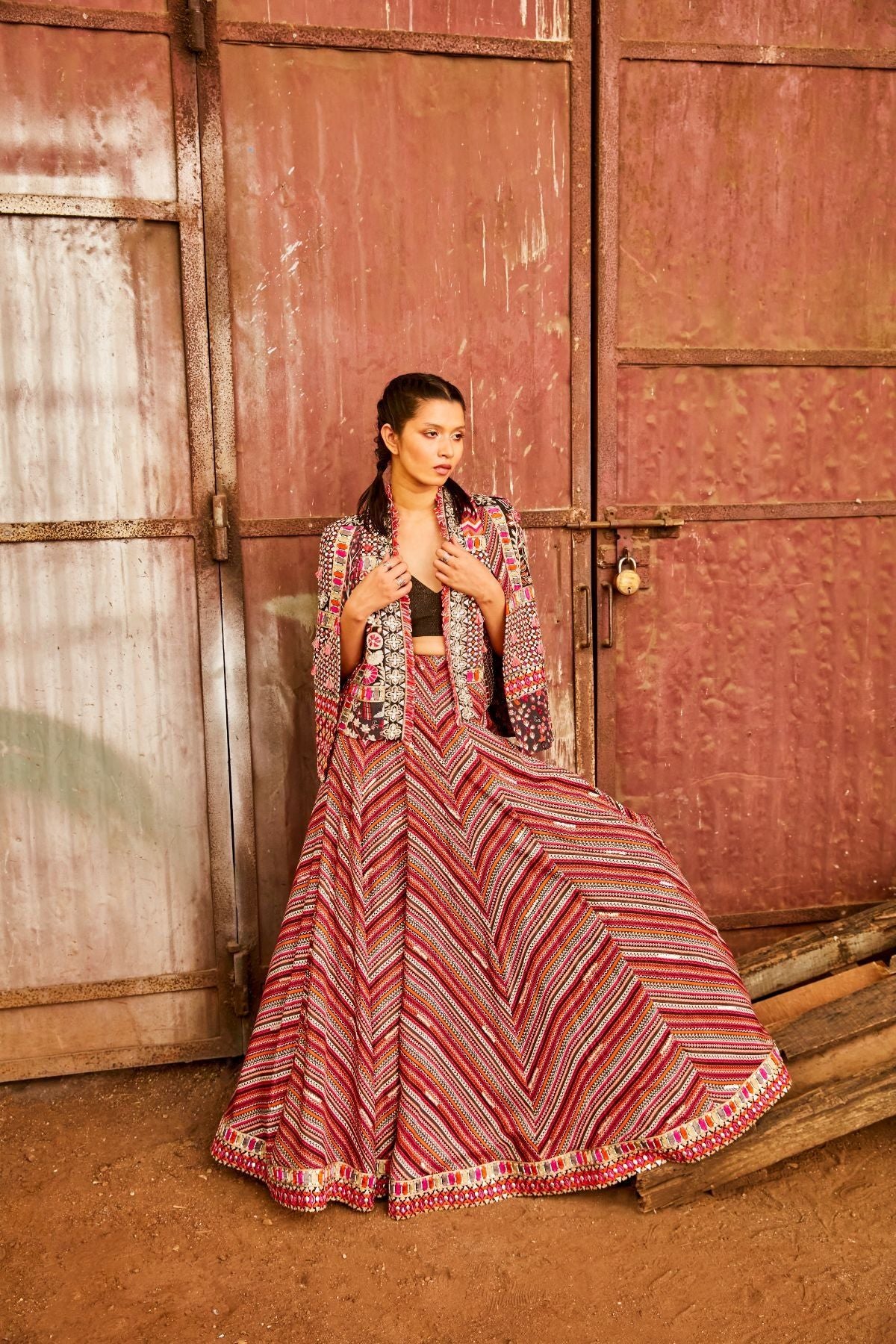 Bohemian Stripe Print Lehenga Teamed With Bustier And Patchwork Noor Jacket