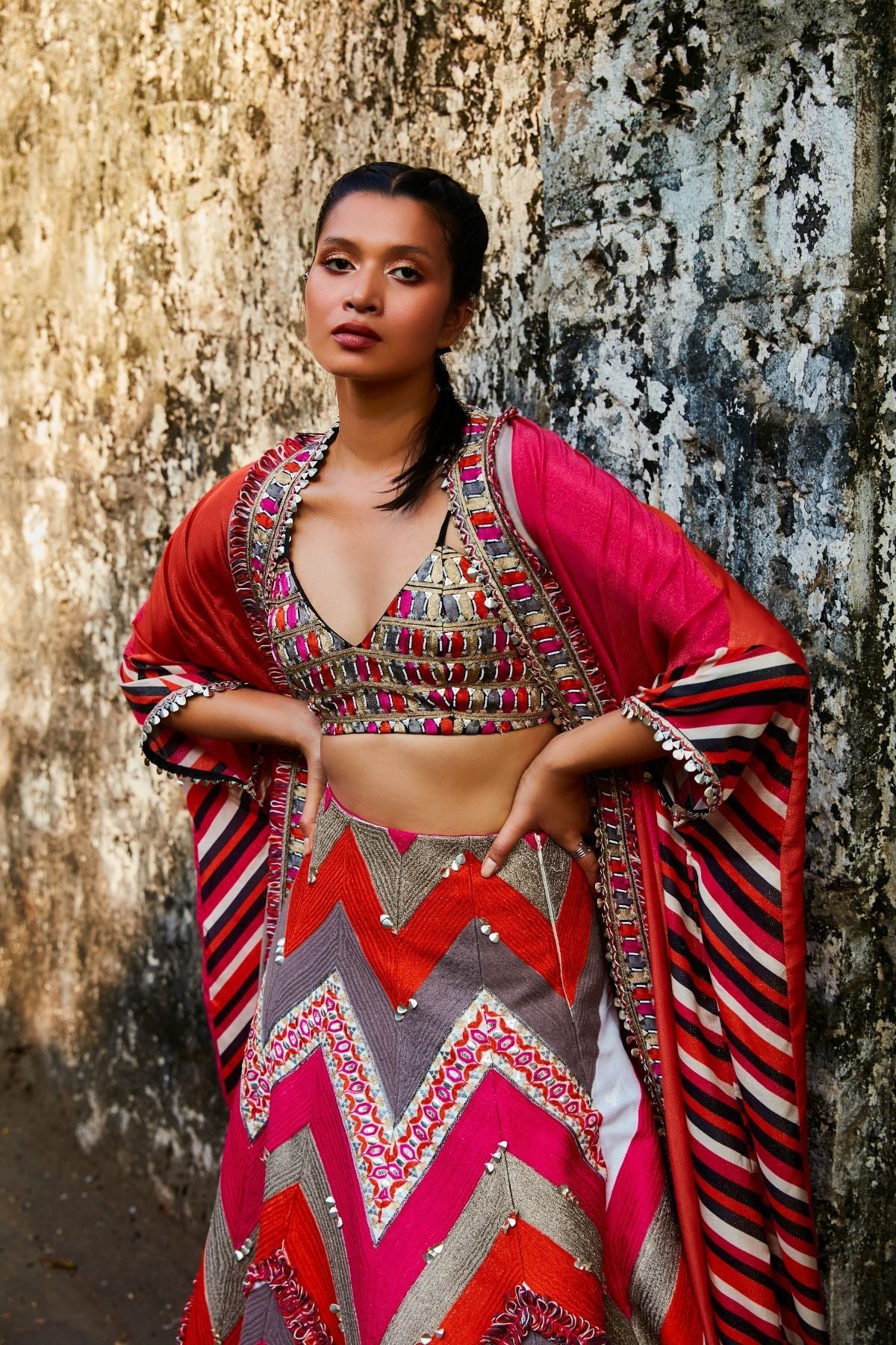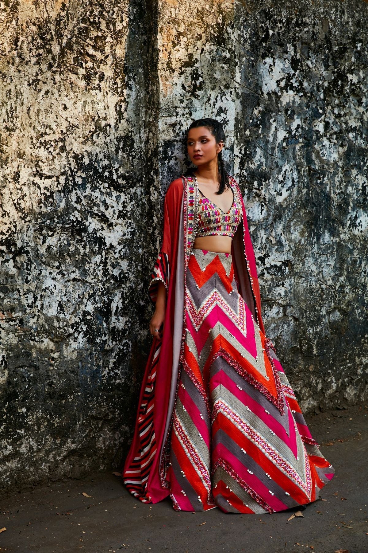 Threadwork Embellished Chevron Lehenga Teamed With A Color Blocked Embellished Cape And Bustier