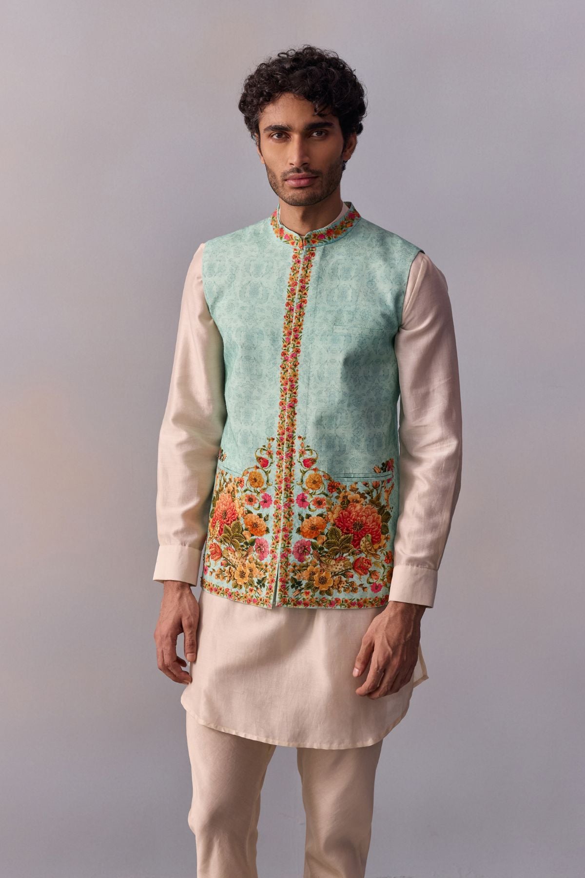 Featuring stylish Bandi jacket with vintage floral print running along the placket & textured thread work, paired with a coordinated Kurta and a matching Churidar. Perfect outfit to ace that contemporary Indian look.