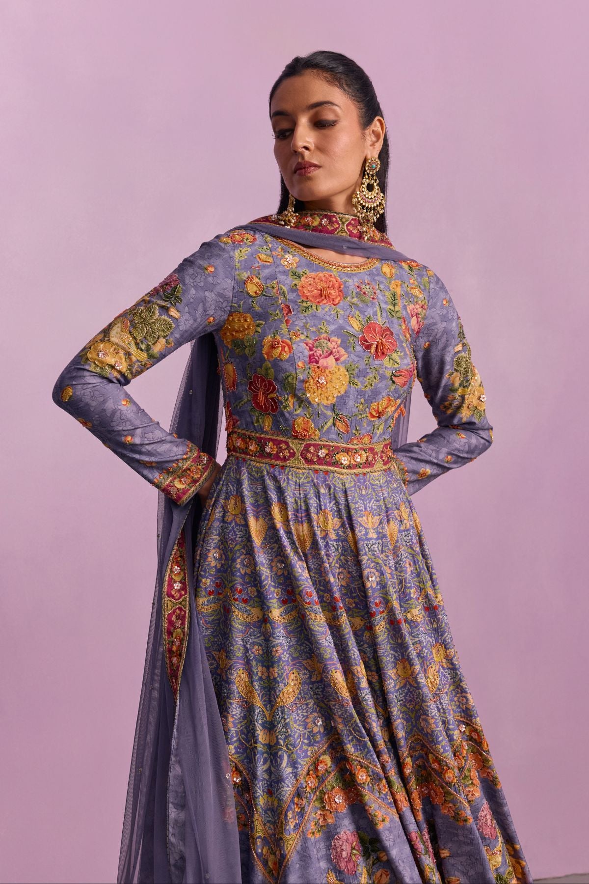 Featuting A Vintage floral design gown anarkali beautifully adorned with intricate hand embroidery on the yoke and border of the outfit. The outfit Is paired with a coordinated dupatta.Perfect outfit to ace that contemporaray Indian Look.