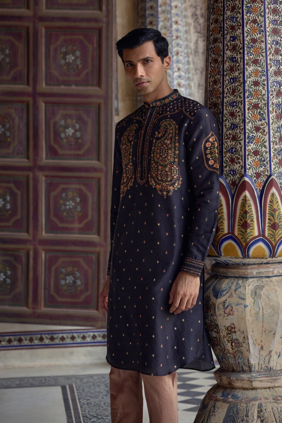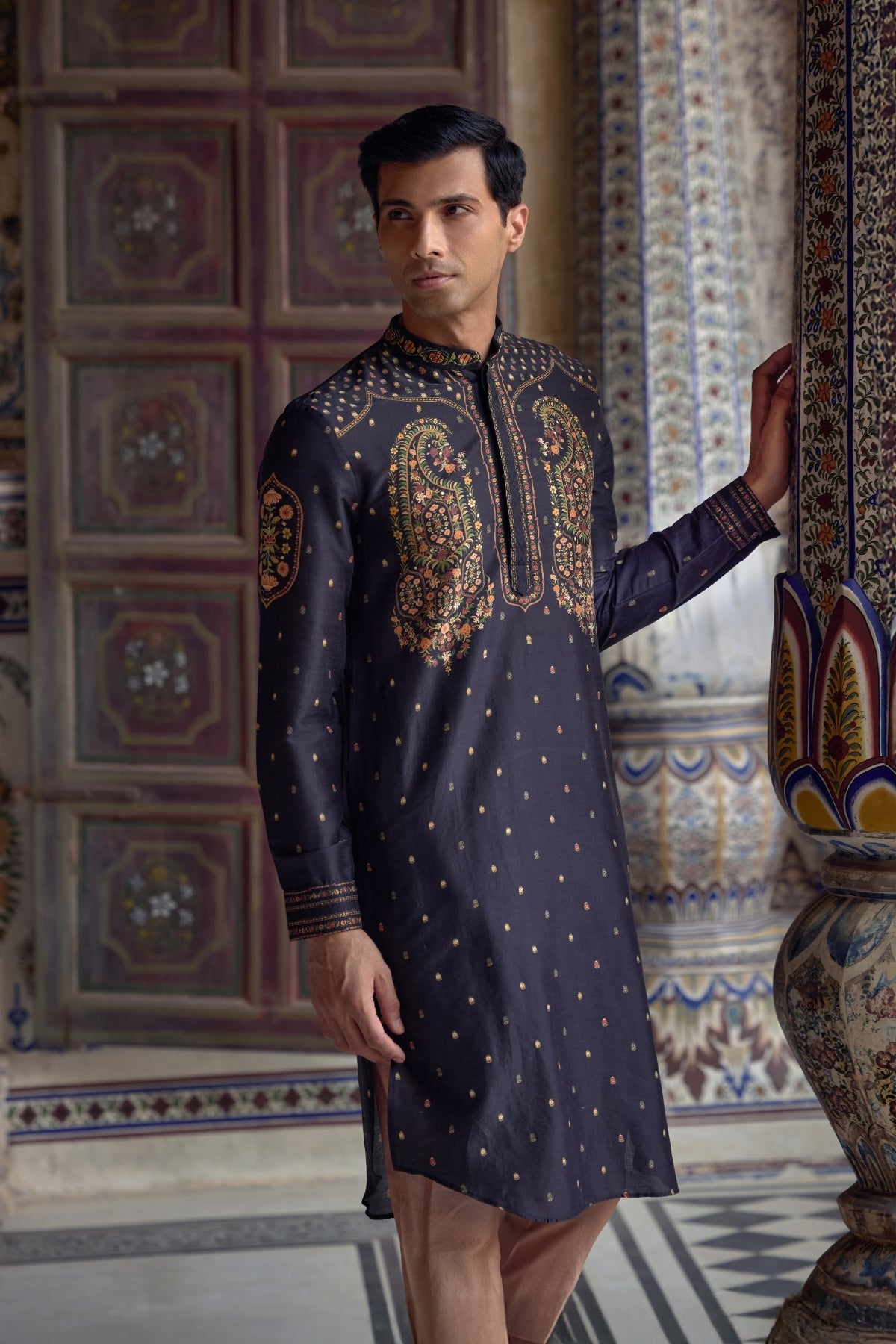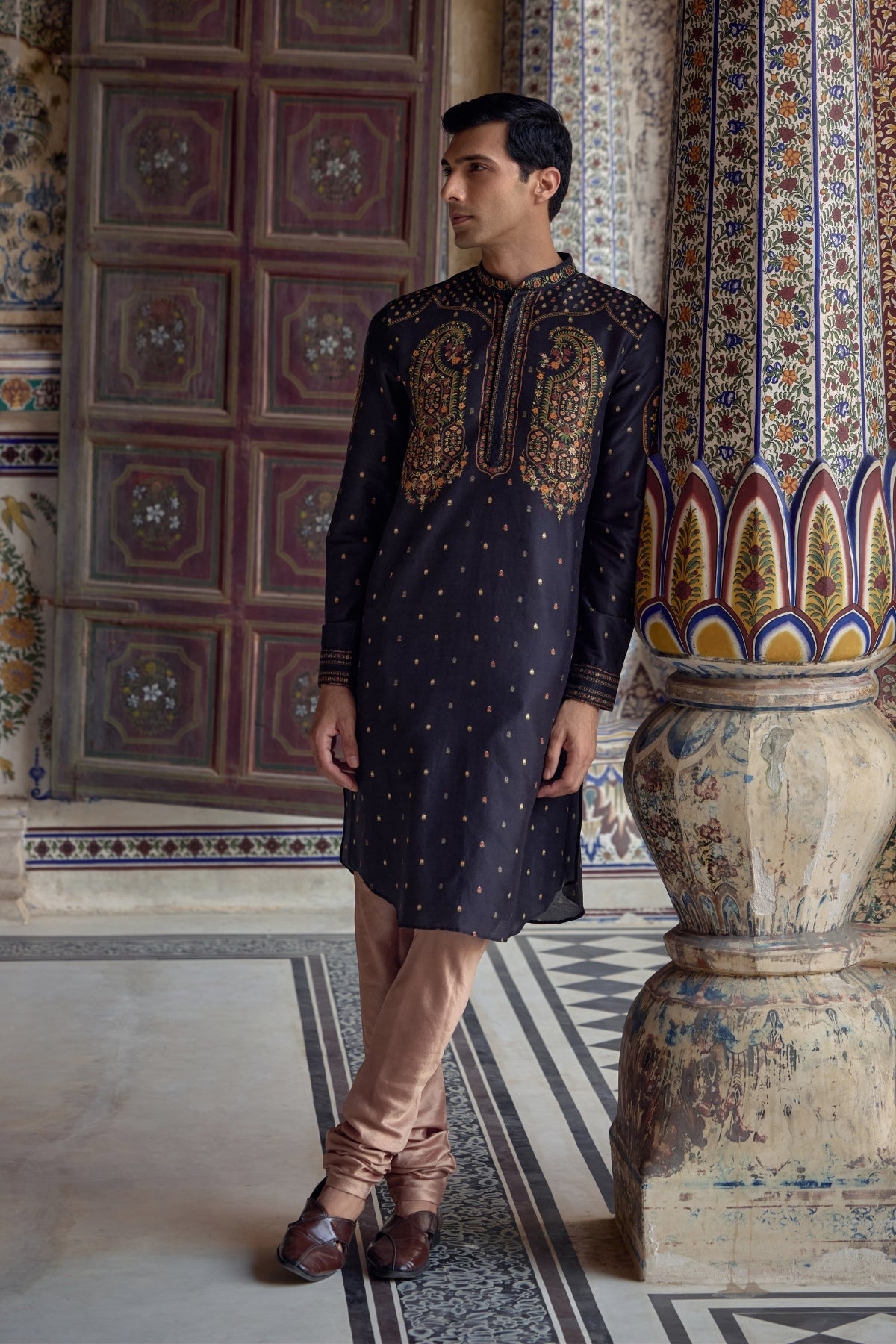 Taimur Kurta Is highlighted with classic paisley motifs with an embroided neckline and placket, styled with a contrasting solid churidar .A perfect outfit for wedding and festive occasion.