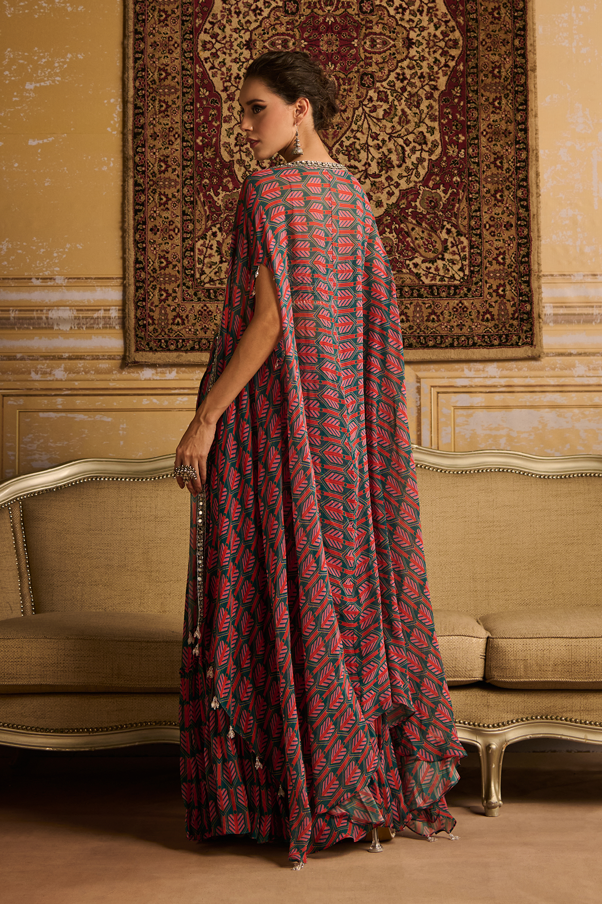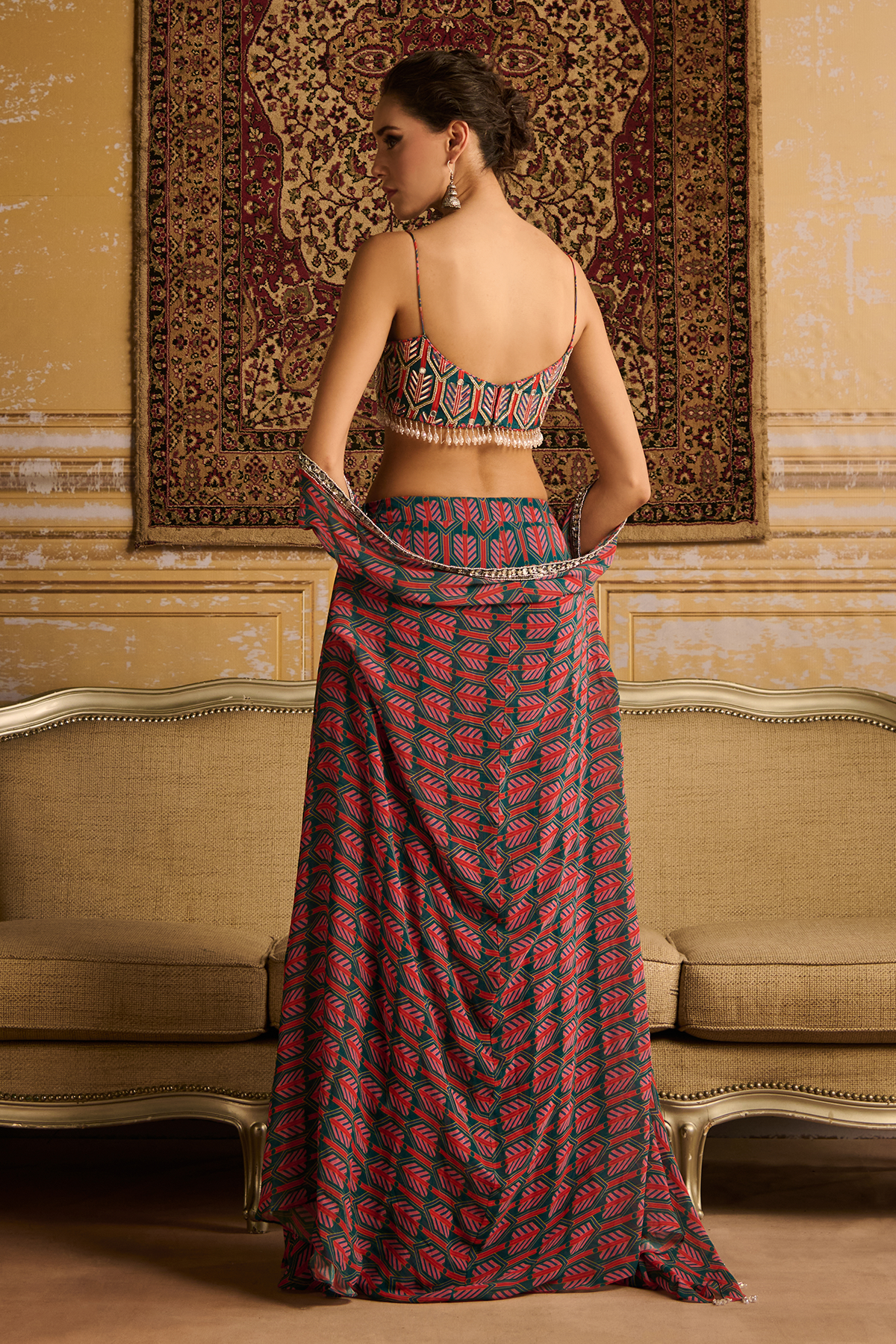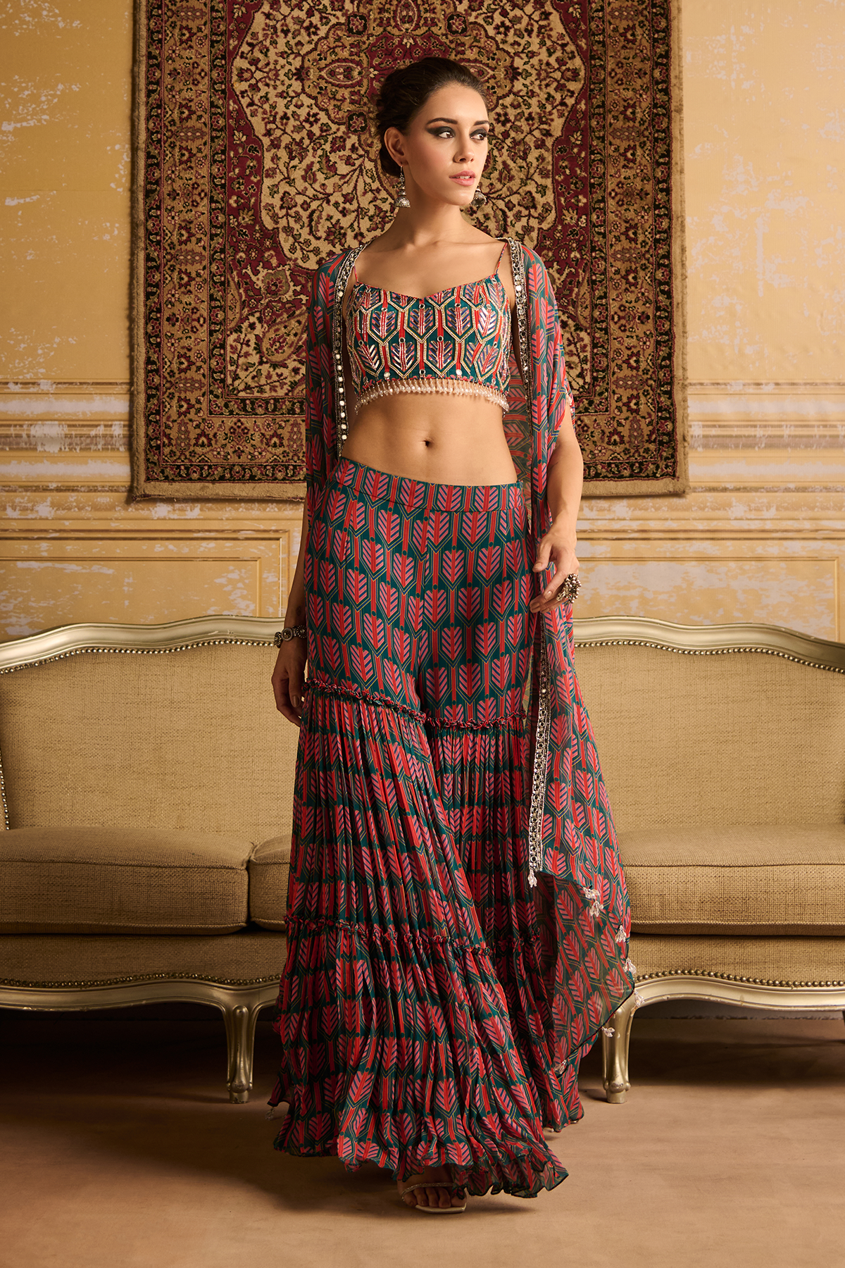 Teal arrow butta print & highlighted crop top paired with tiered gharara pants and embroidered border detailed cape