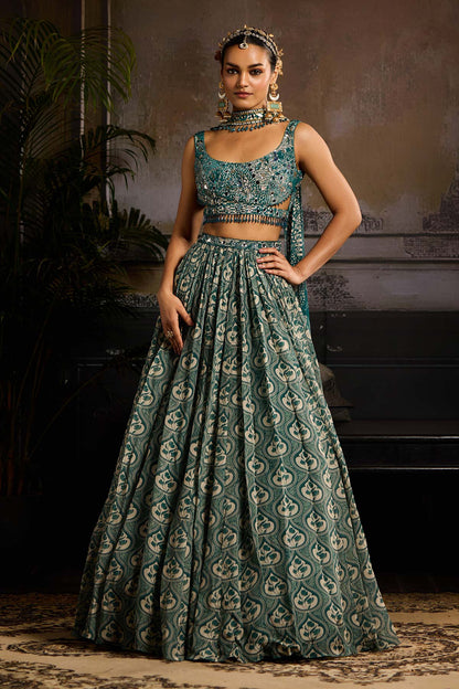 Teal Abstract Jaal Print and Highlighted Blouse and Teal Leaf Printed Lehenga with Choker Dupatta