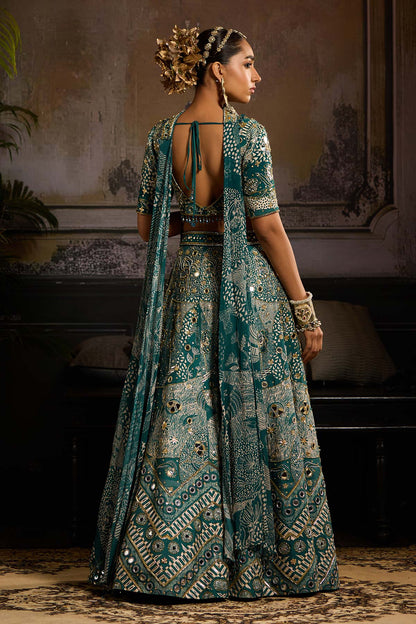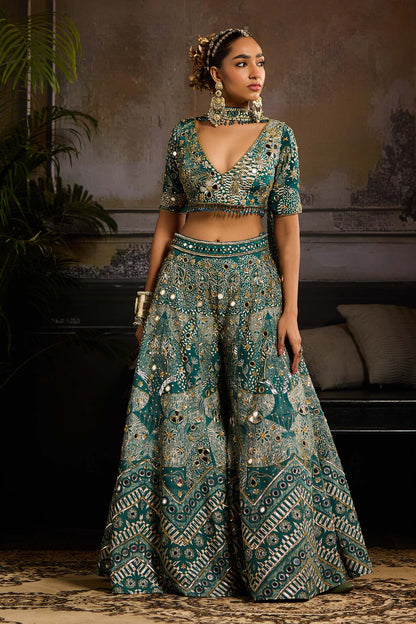 Teal Abstract Jaal Print and Highlighted Blouse and Teal Abstract Jaal Print and Highlighted Sharara with Choker Dupatta