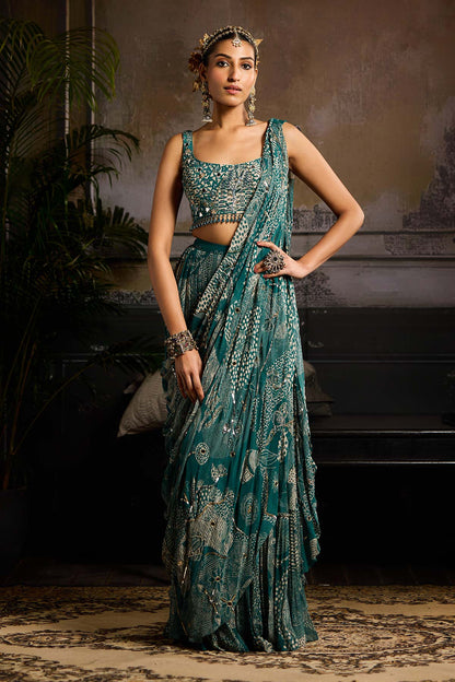 Teal Abstract Jaal Print and Highlighted Blouse and Teal Abstract Jaal Print and Highlighted Tiered Skirt Saree