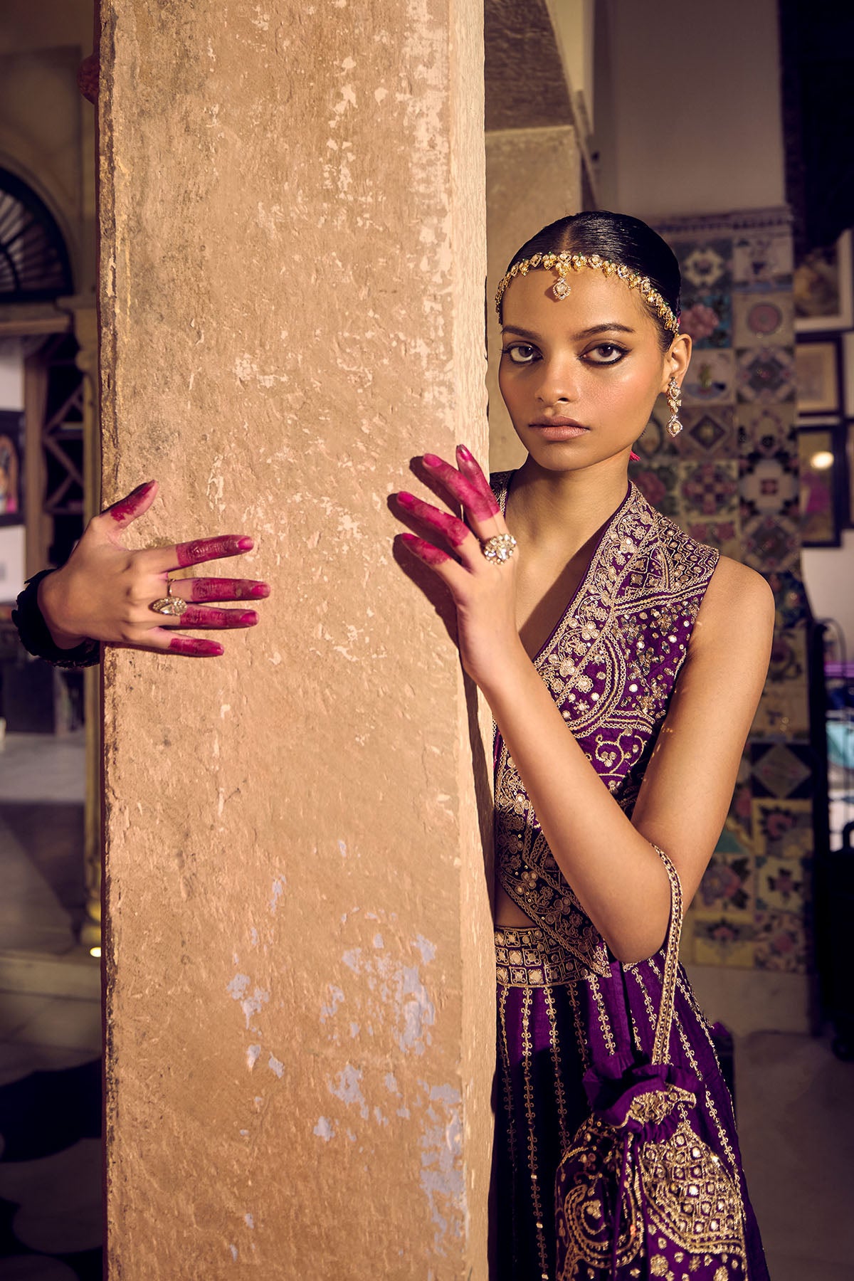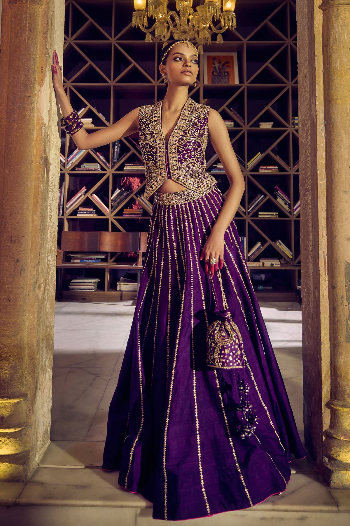OurBaingani Amber Skirt Set Is An Ode To The Vibrant Culture. The Sleeveless Koti Blouse Is A Nod To Traditional Sensiblities. The Intricate Gota, Marodi And Dori Work On The Blouse Shines Brilliantly, While The 'Chadhi Ka Kaam' On The Skirt Adds A Regal Touch. As Flowy As The Outfit Is, It Is Just As Sleek, Promising Comfort And Easy Movement.