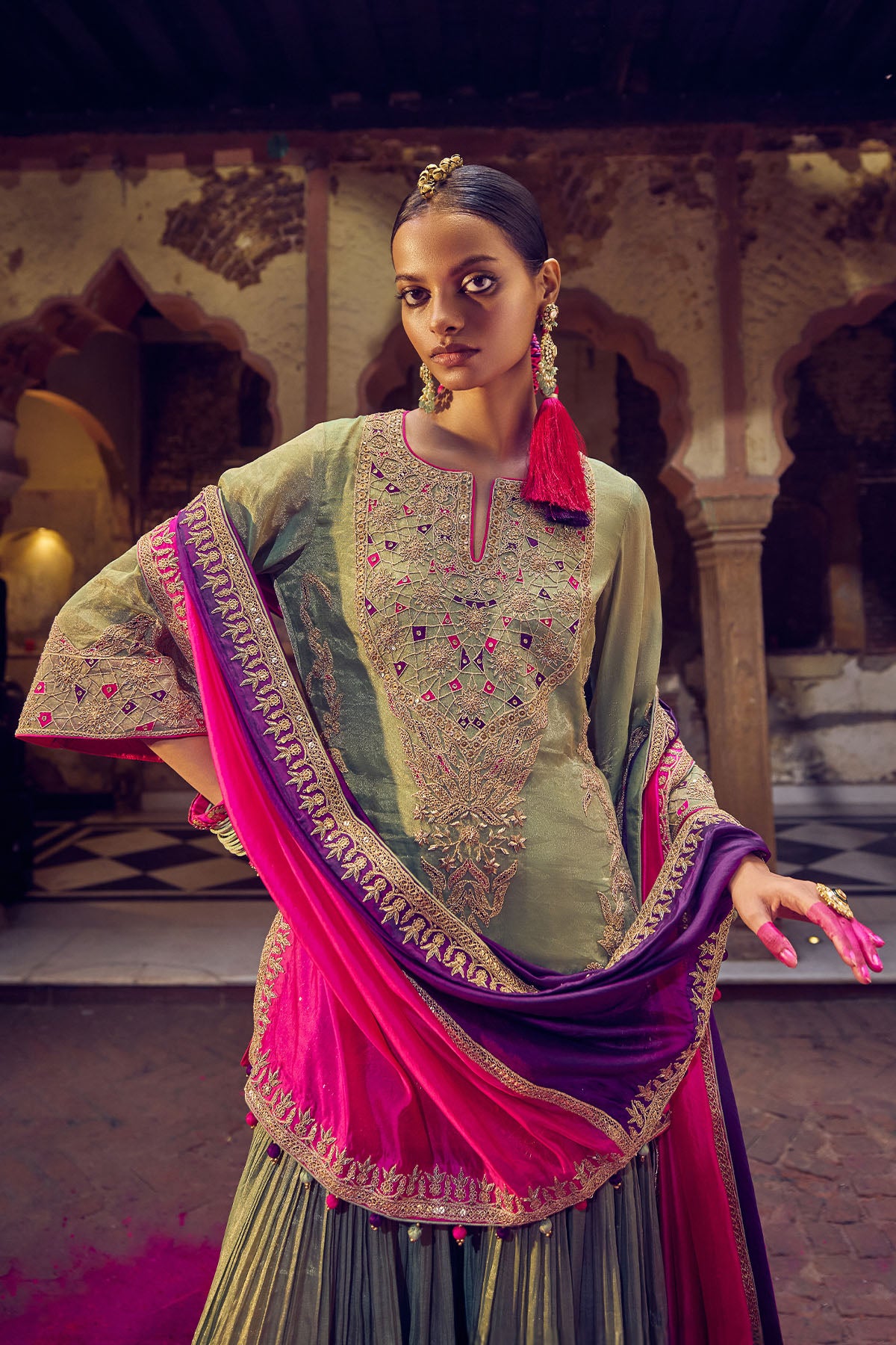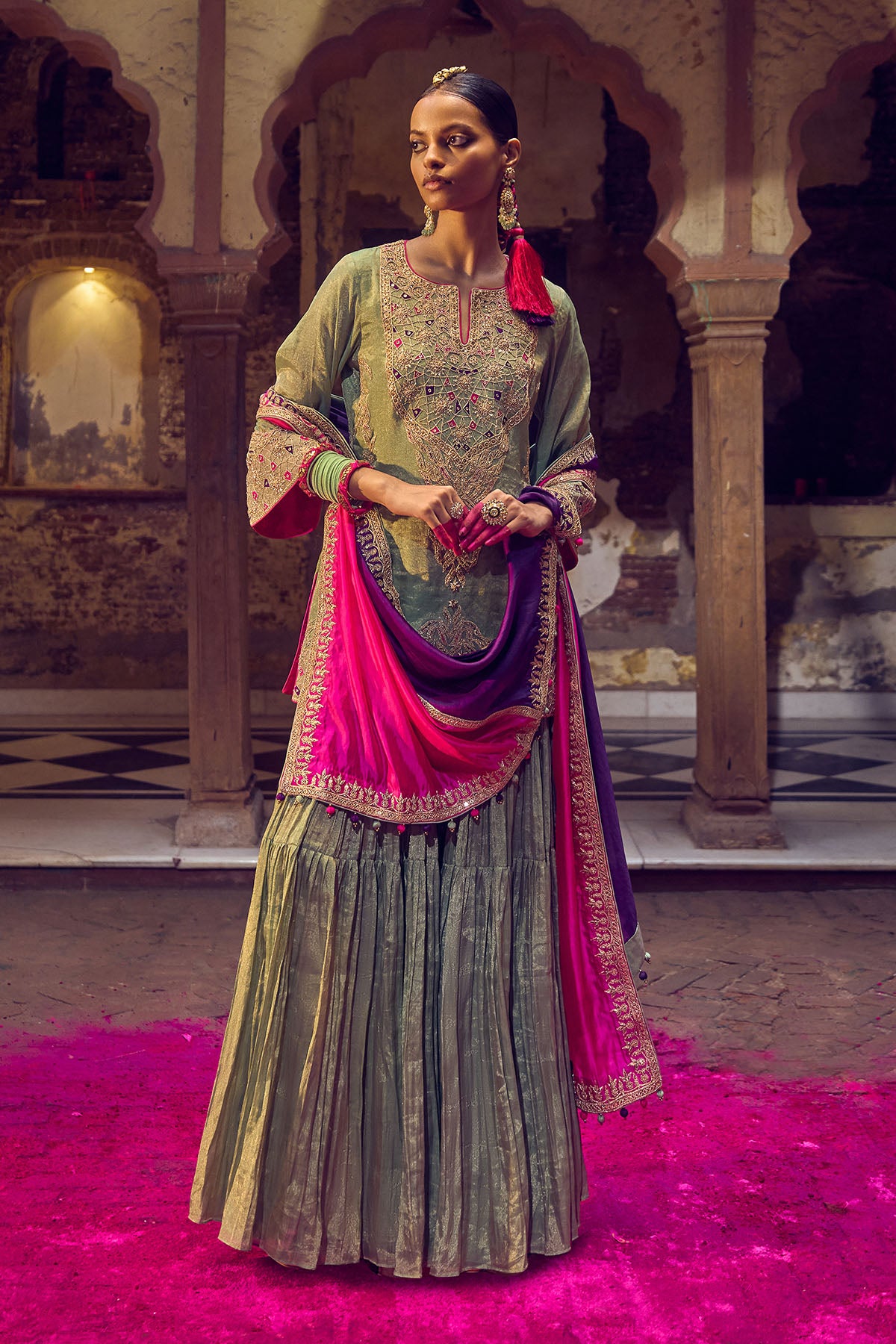 Our Signature Sage Gharara Set Embroidered With Hand Marodi And Applique Work, Paired WithBaingani And Gulabi Gulaal Dupatta.