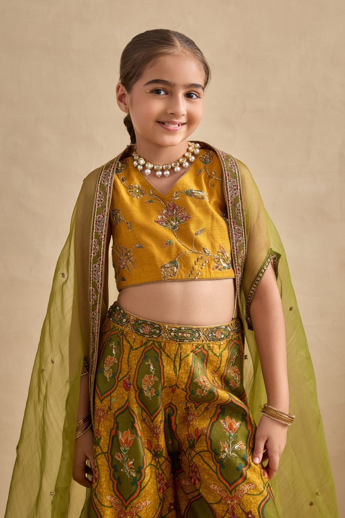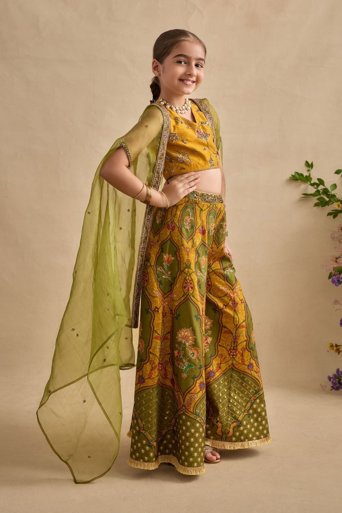 Colour: BLOUSE AND SHARARA - MUSTURD YELLOW , CAPE- LIME GREEN