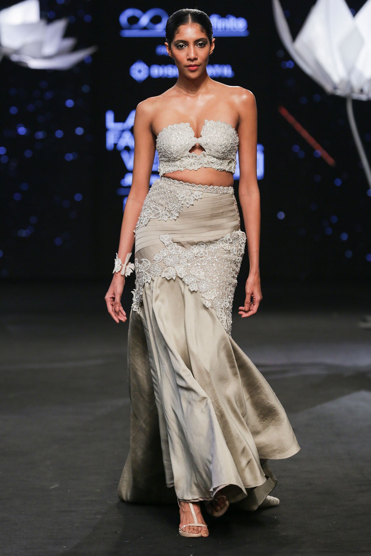 Grey green dupion fitted pleated skirt emphasised with ghera at bottom detailed with geometrical pattern embroidery styled with cutout corset blouse