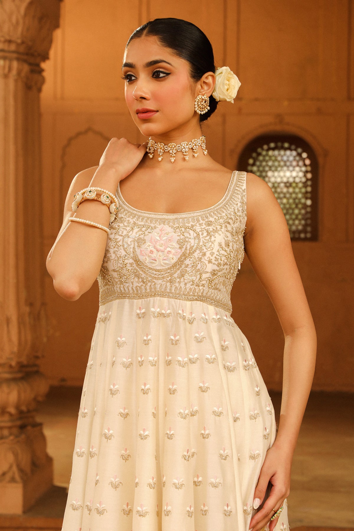 The long ankle-length Kalidaar anarkali is made in pure silk chanderi fabric teamed up with a churidar and a silk organza dupatta. The outfit has a broad deep scoop neck and a deep back. The outfit is adorned with Kashmiri tilla and Parsi gara embroidery highlighted with basra moti. The outfit is finished with scallop detailing.