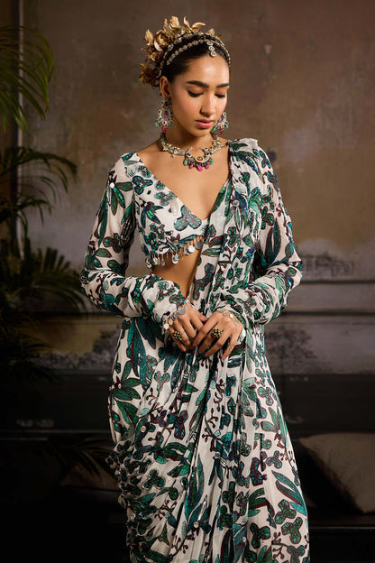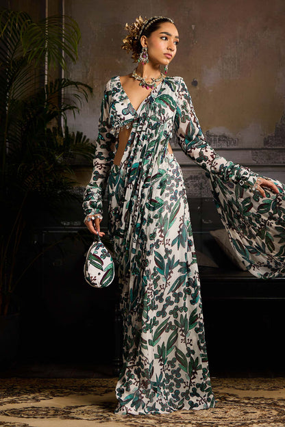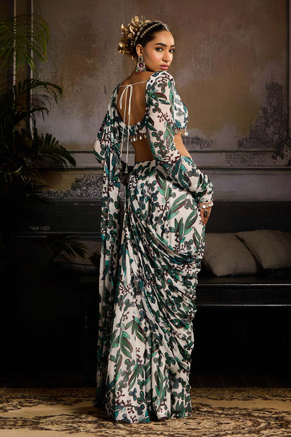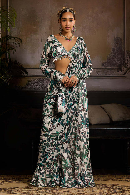 White & Teal Leaf Jaal Print and Highlighted Blouse with Prnt & Highlighted Draped Sharara Pants Saree & Potali Bag