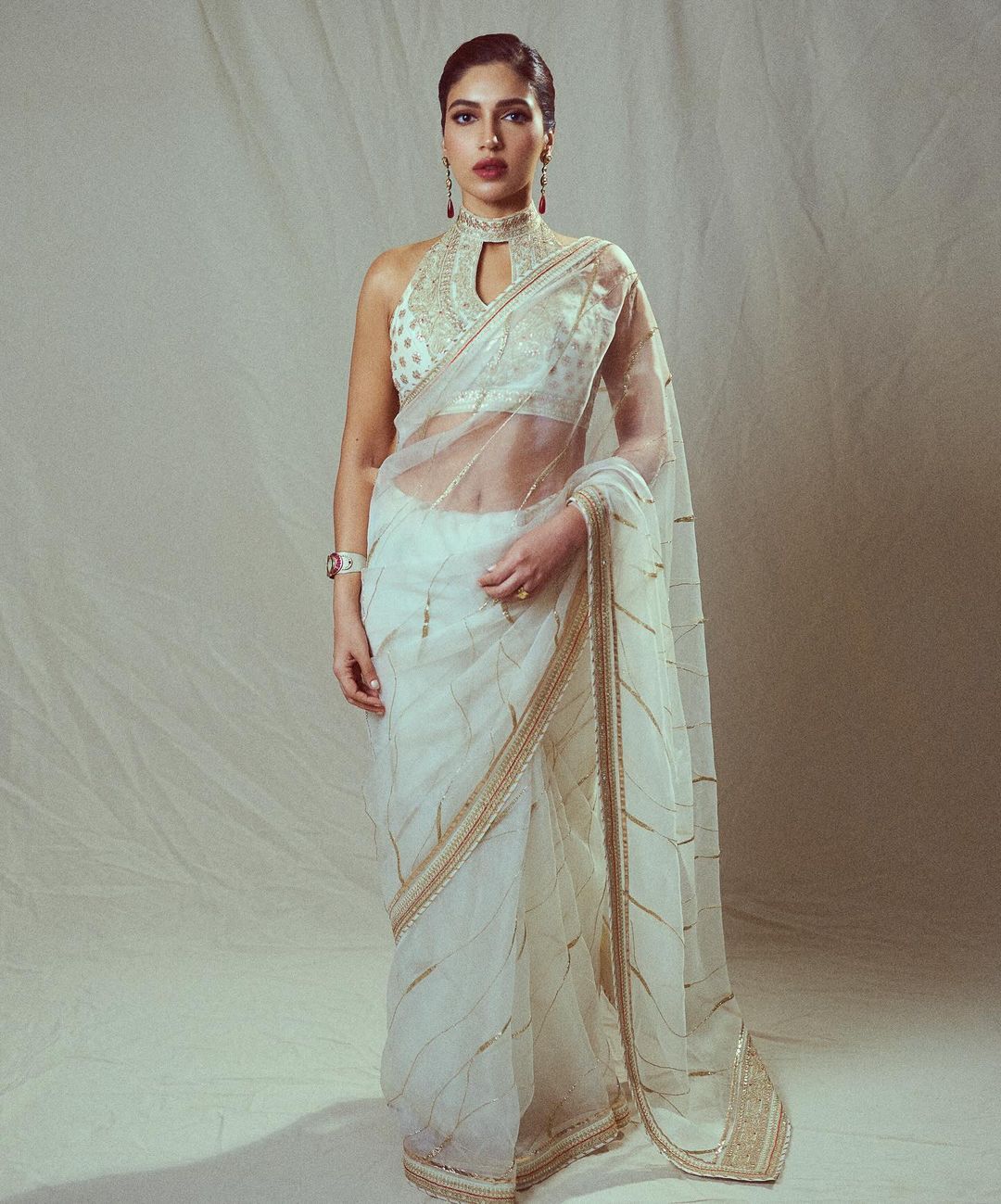 Radiate timeless beauty in this beautiful organza saree set, where subalpine detailing paired with a halter neck blouse creating a captivating look for special occasions. The blend of traditional craftsmanship and modern sensibilities makes it a must-have for those seeking a perfect balance between traditional yet evergreen style.