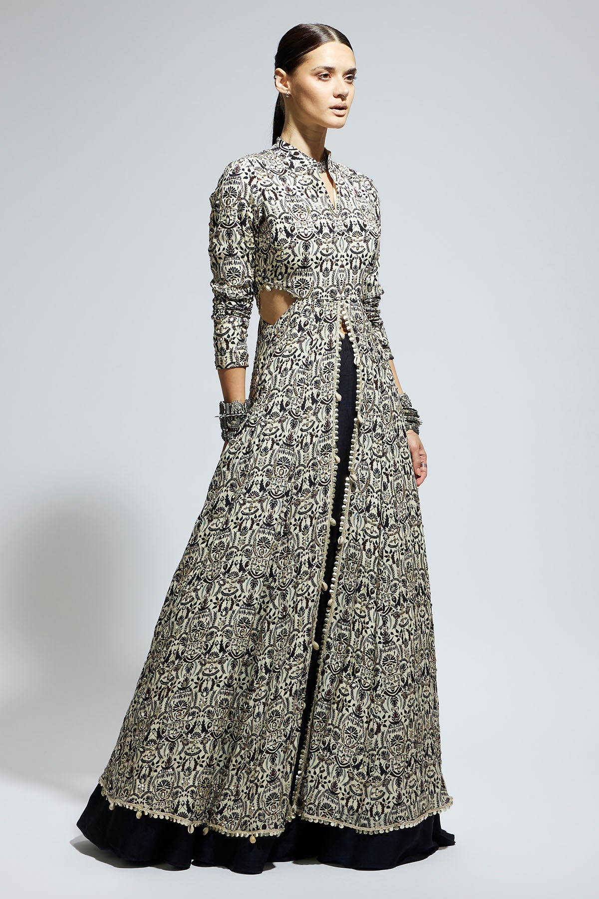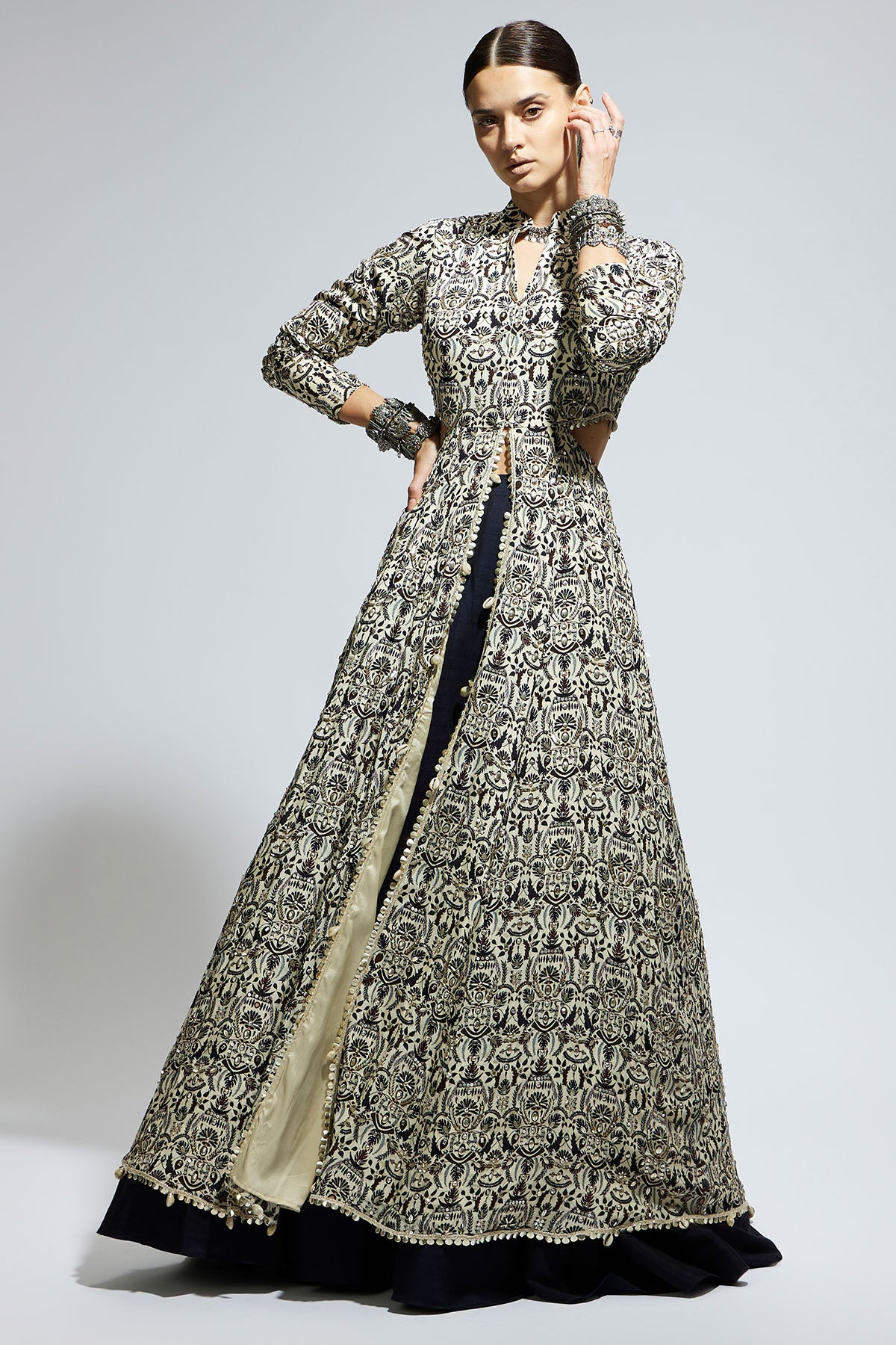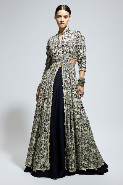 White Heavily Embellished Waist Cut out Jacket Paired a Midnight Blue Lehenga
