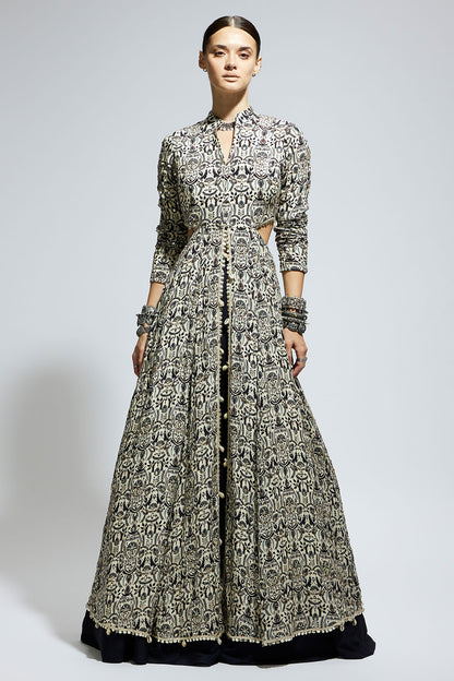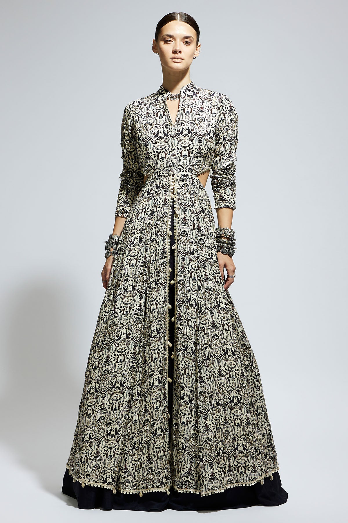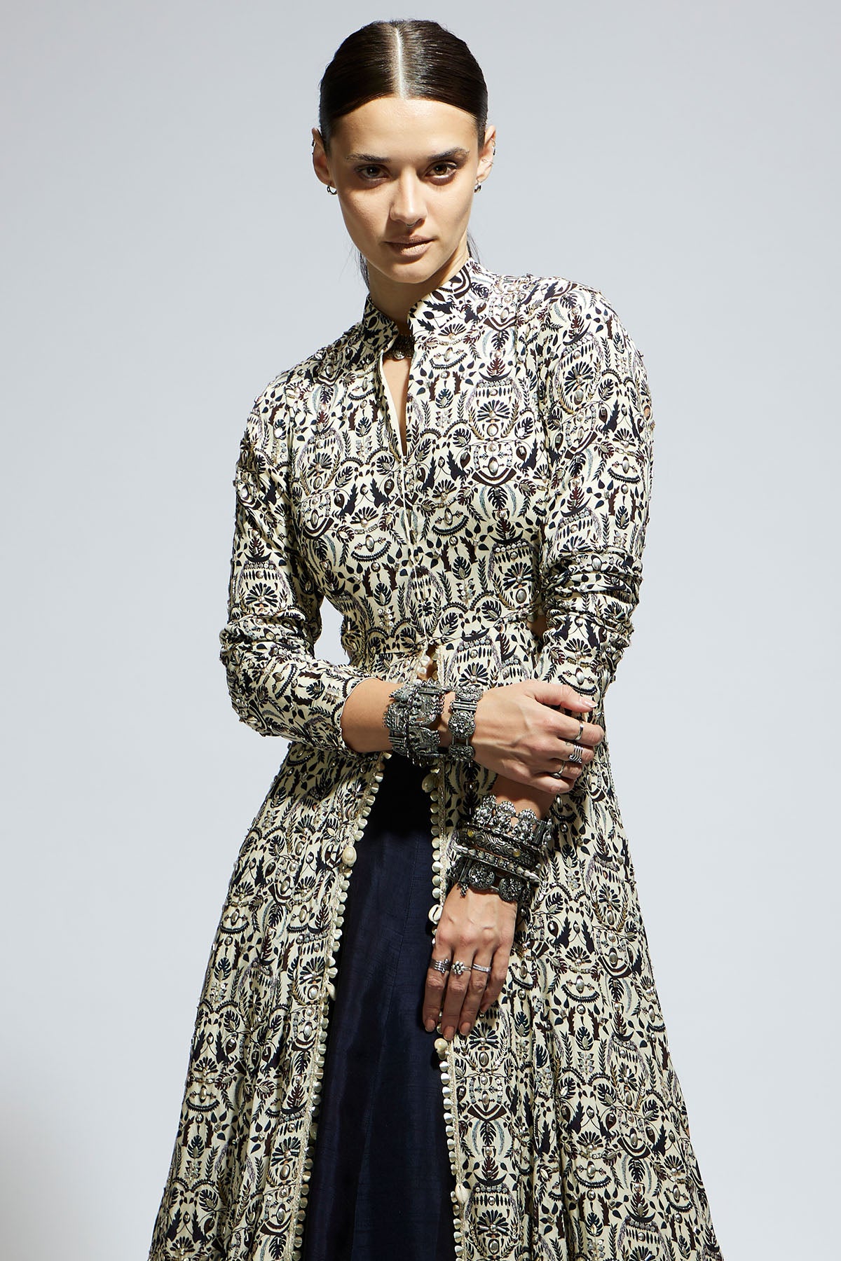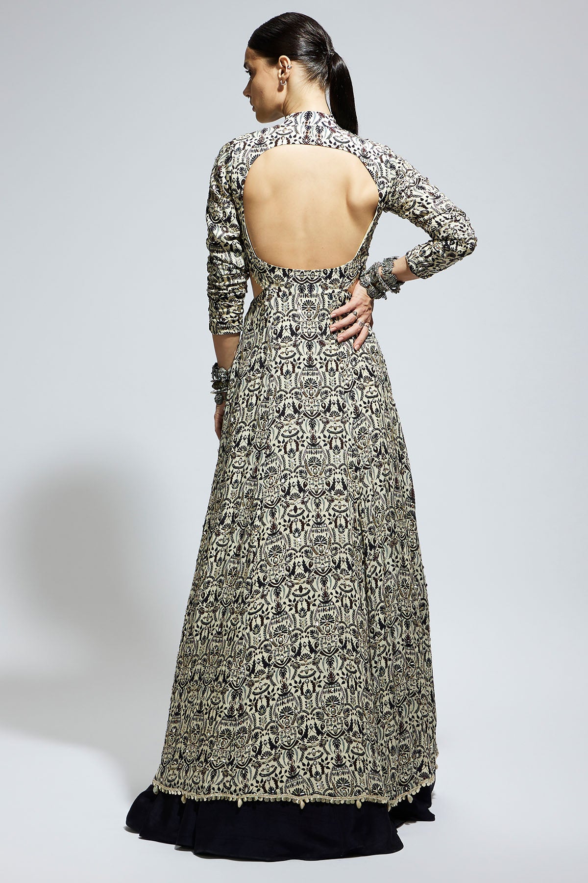 White Heavily Embellished Waist Cut out Jacket Paired a Midnight Blue Lehenga