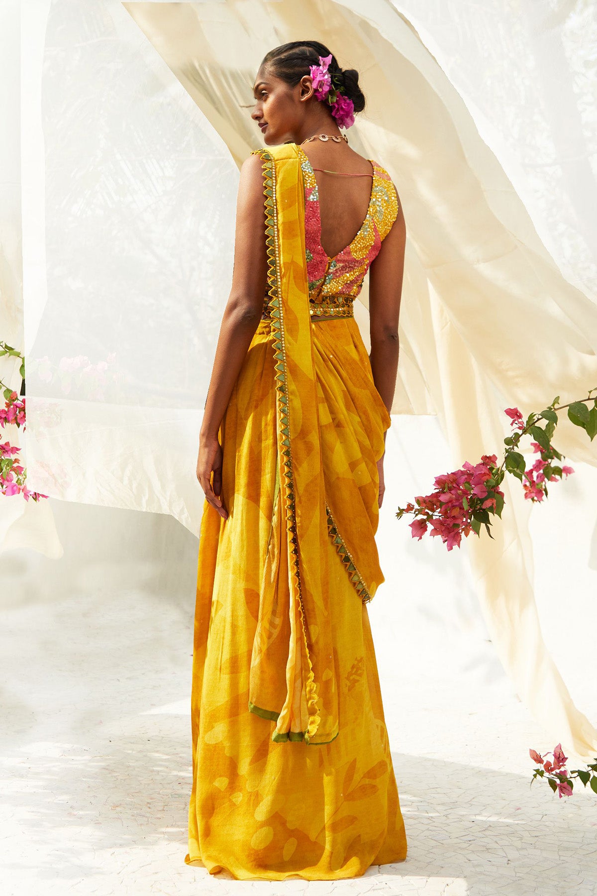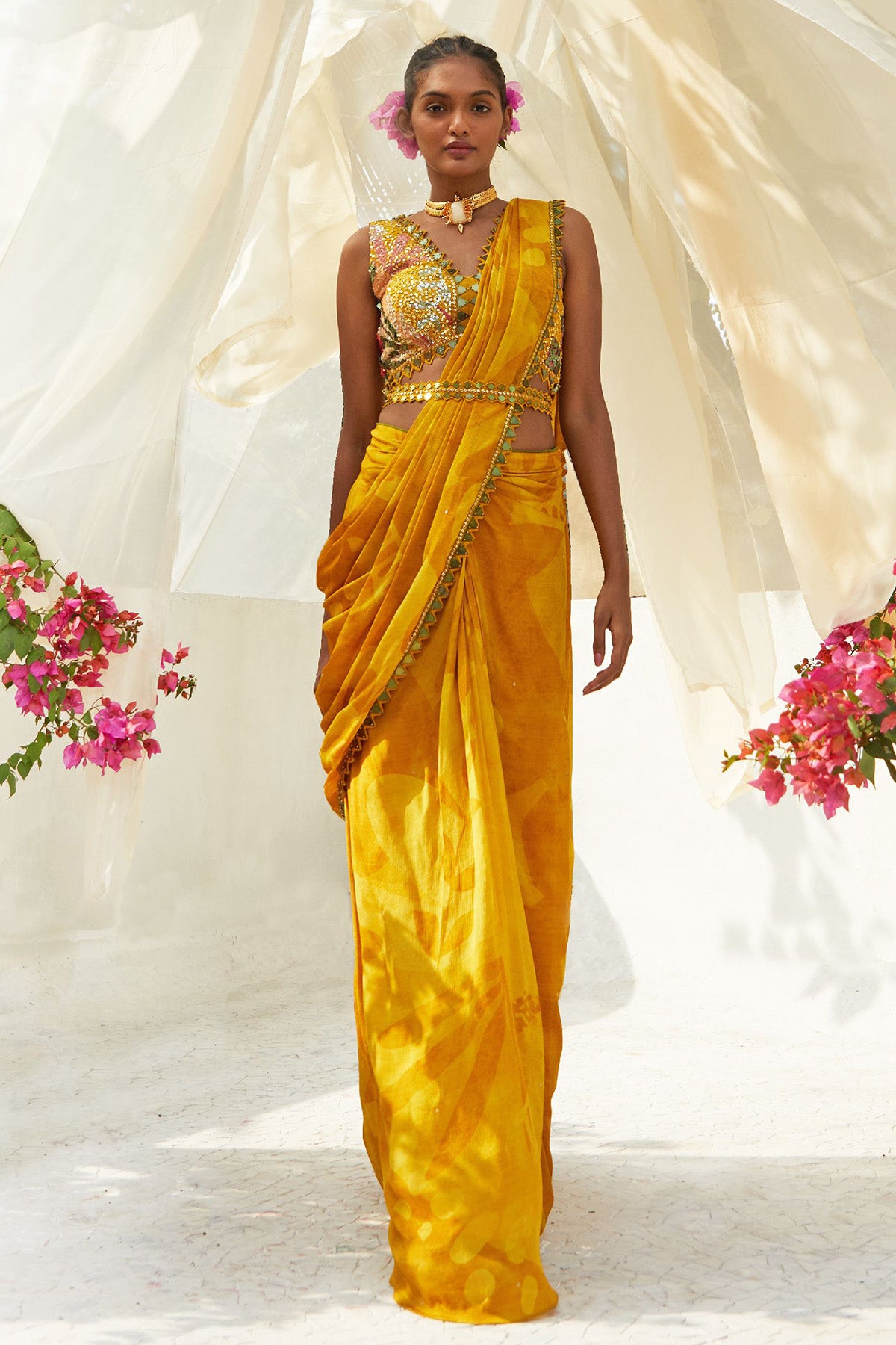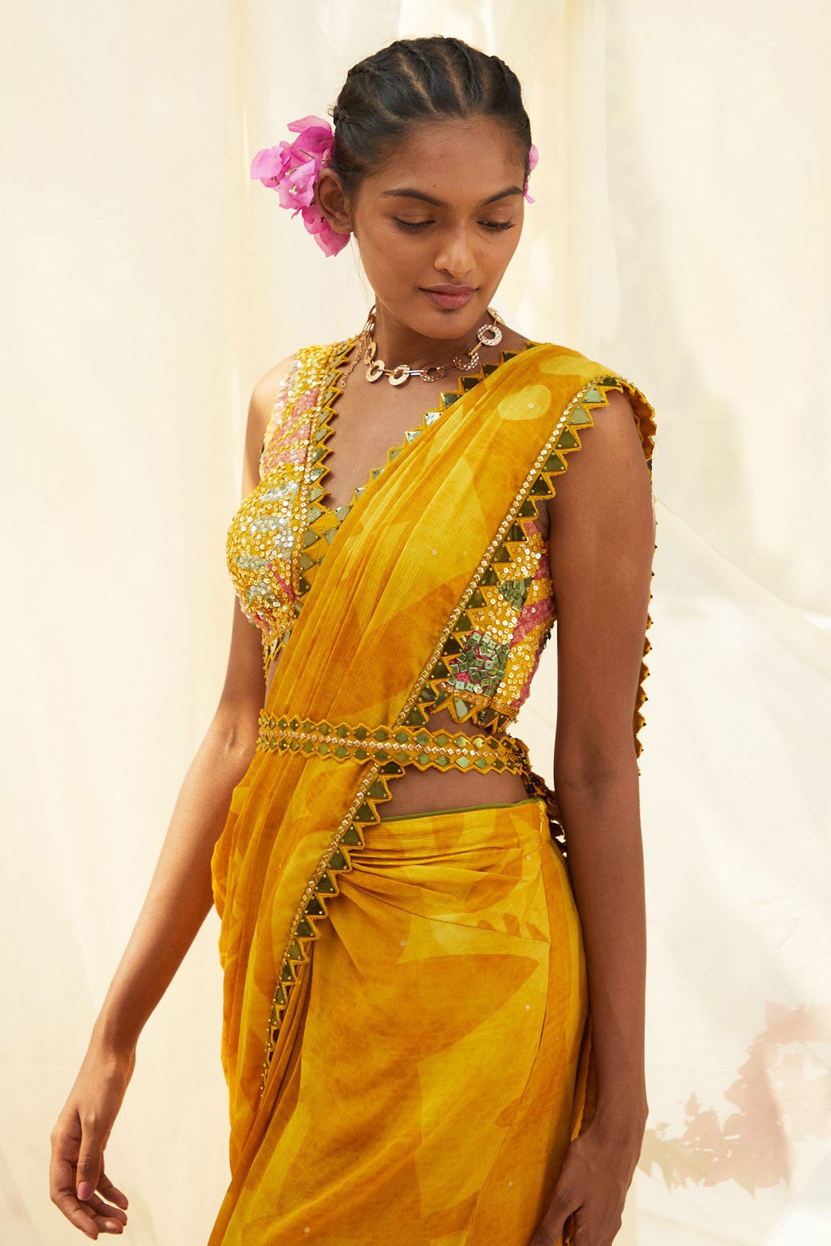 Elevate Your Style Game with Our Yellow Predraped Saree, Featuring Embellished Blouse, Trendy Belt and Saree Drape Perfect for Fashionista in You