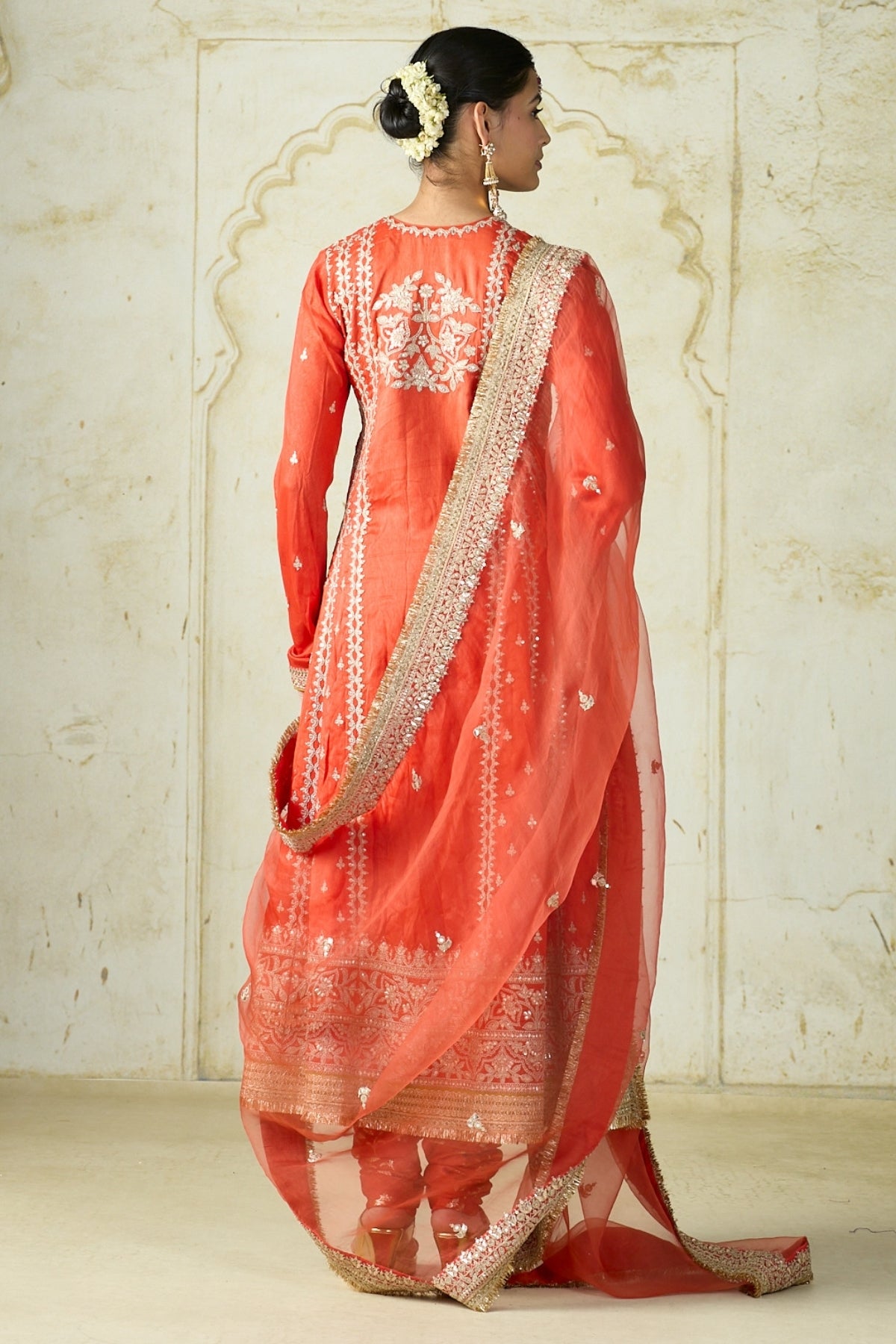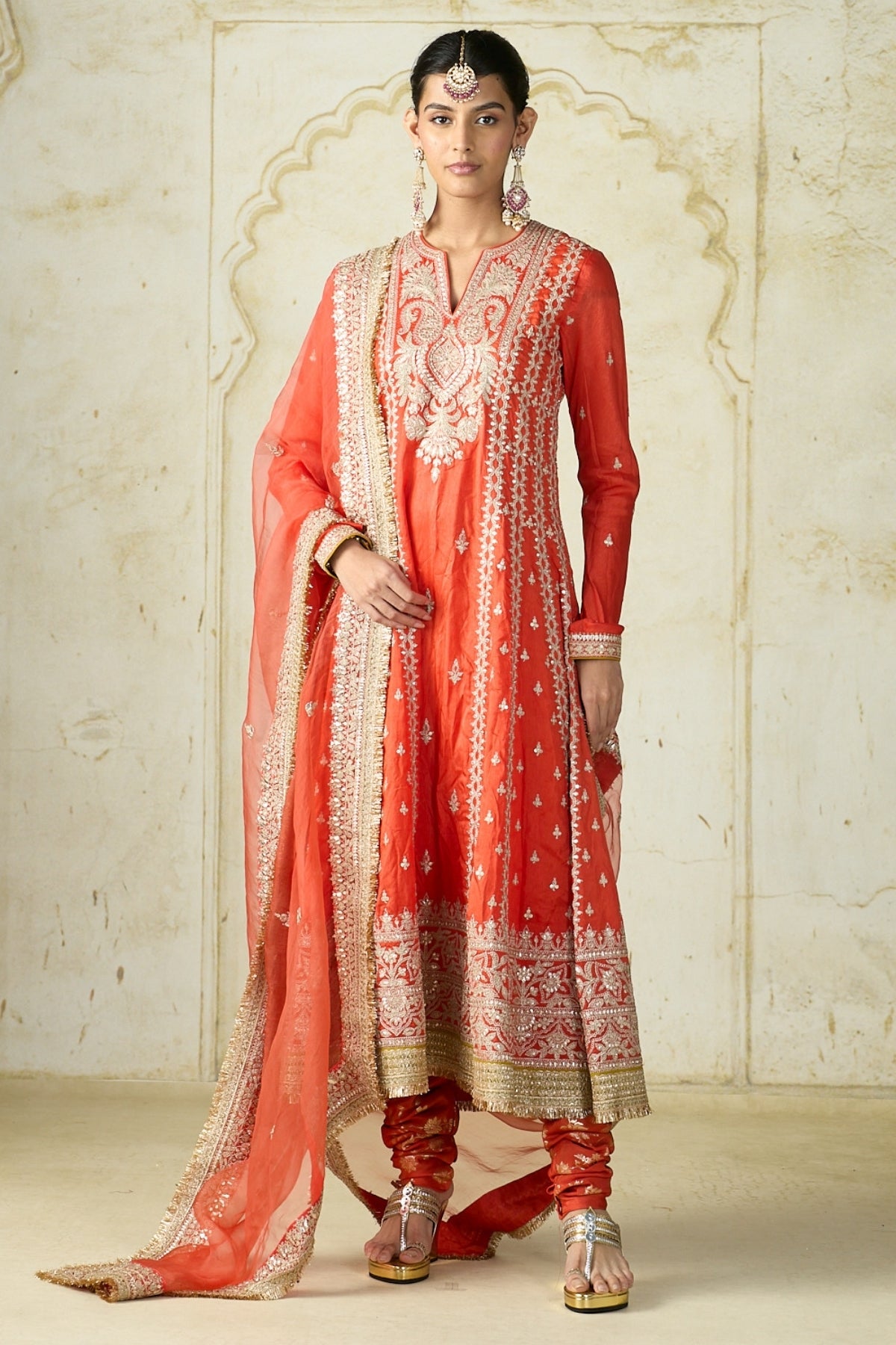 Featuring a beautifully embroidered long kurta adorned with intricate, delicate motifs along the neckline, sleeves, and borders. The hemline is richly embellished with ornate detailing, adding depth and elegance to the outfit. It is paired with matching churidar pants and a sheer dupatta edged with heavy embroidery.