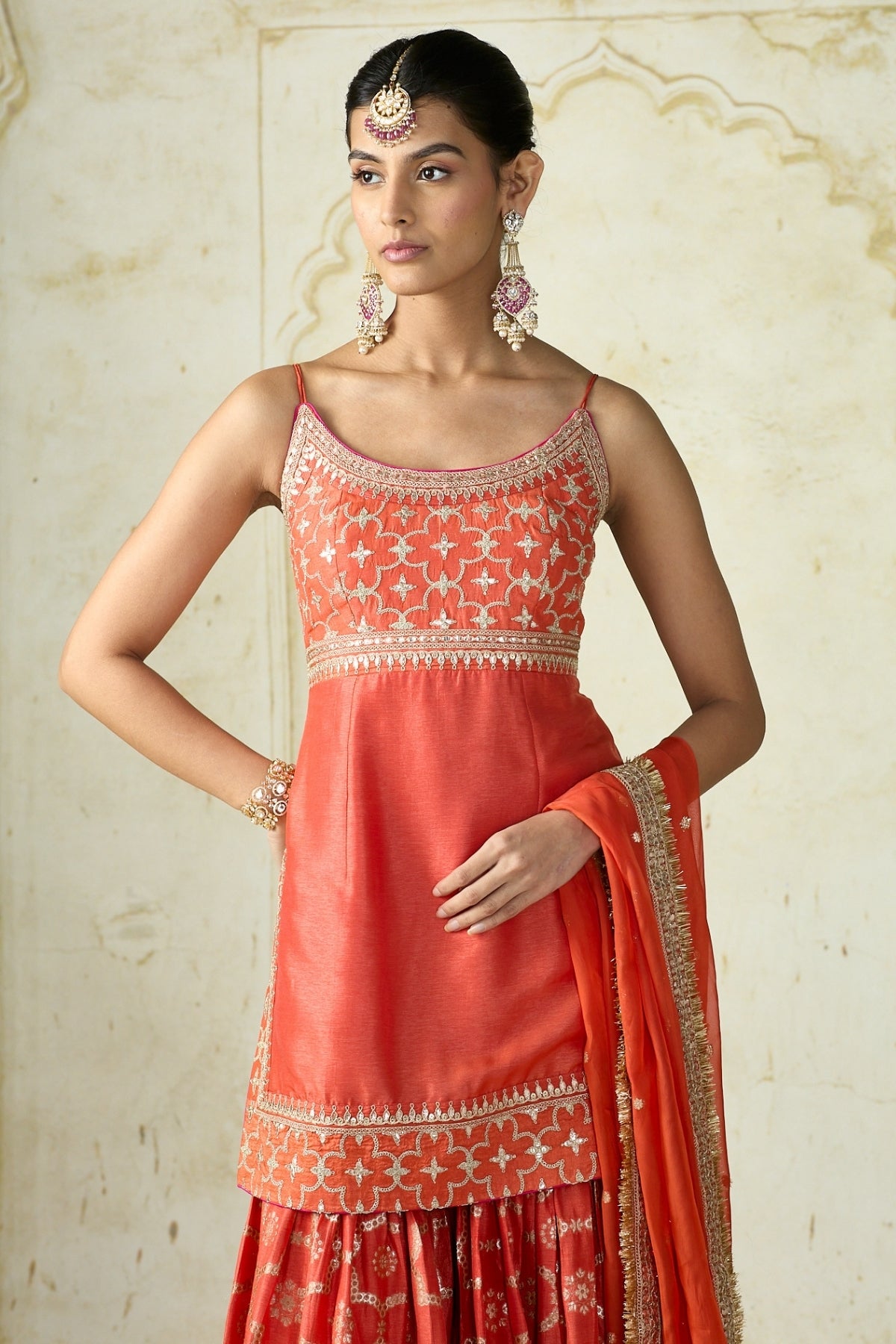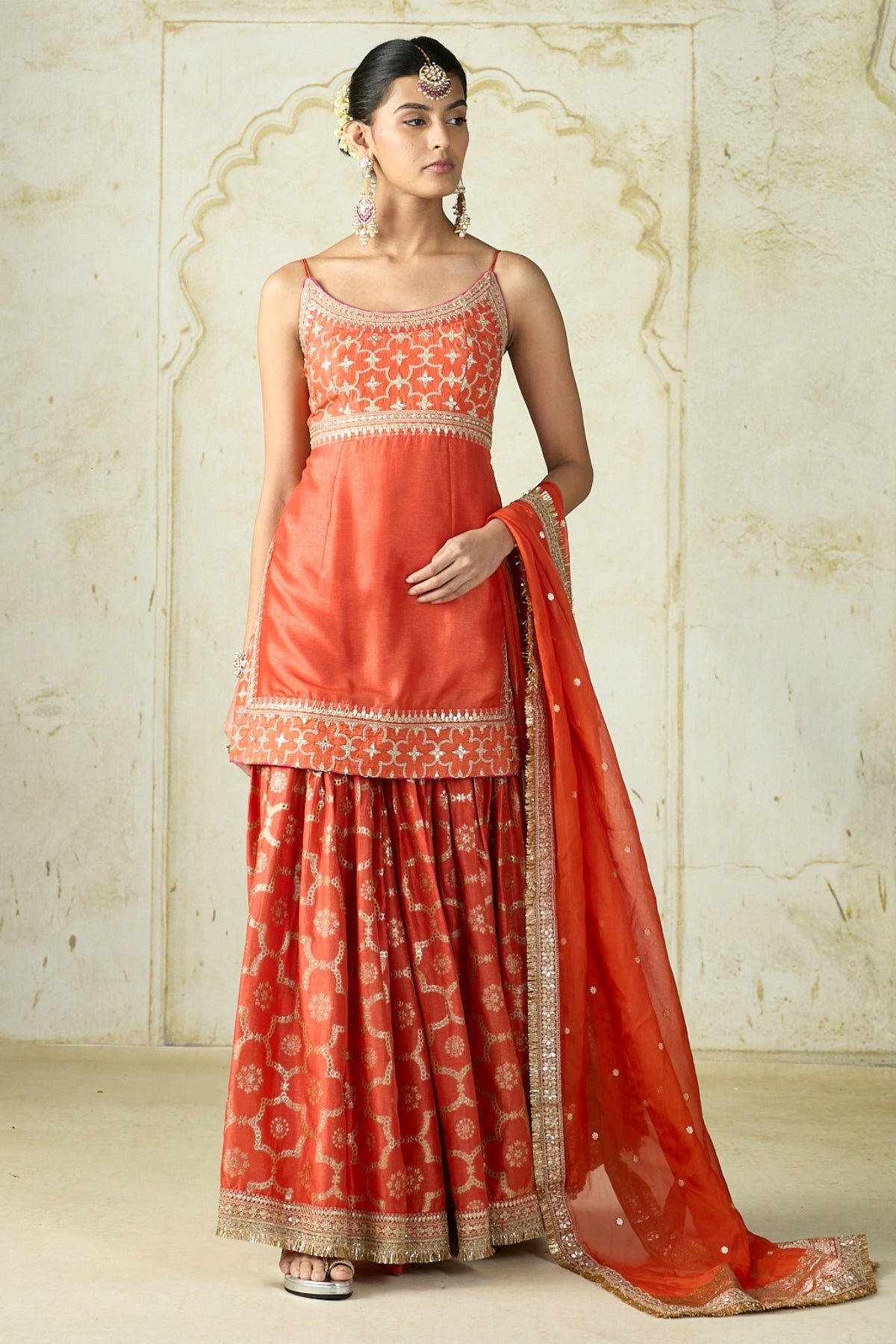 This vibrant traditional ensemble radiates festive elegance with its youthful silhouette. The sleeveless kurta is adorned with delicate embroidery on the neckline and waistline, paired with a sharara featuring intricate woven patterns and a richly embellished hem. The look is completed with a sheer dupatta.