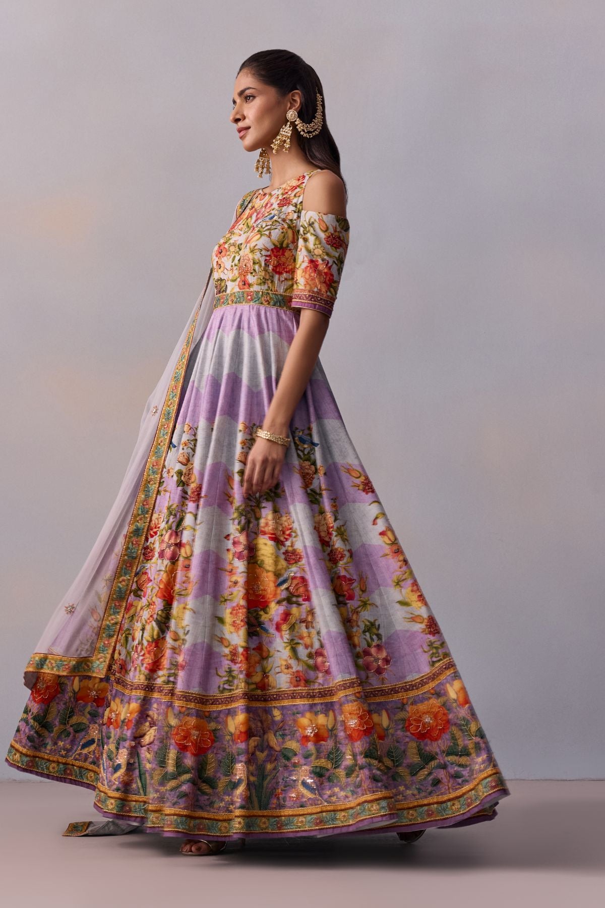 Featuring An Elegant Interplay of floral motifs with intricate hand embroidery . It Is Paired with a meticulously embroidered thread and hand beadwork On yoke and stylish sleeves. Styled with a Co-ordinated dupatta with border. An Elegant Outfit With A Touch Of Grace To Glam Up Your Party Look.