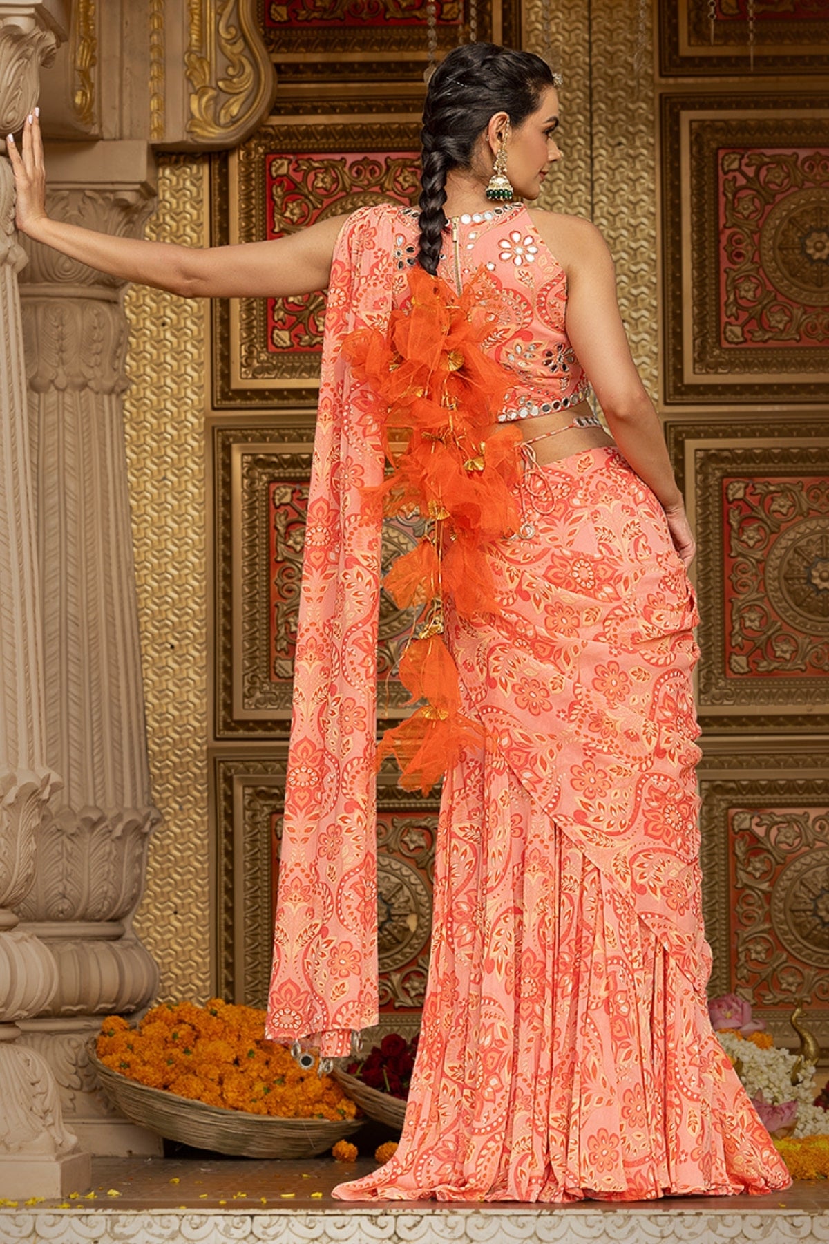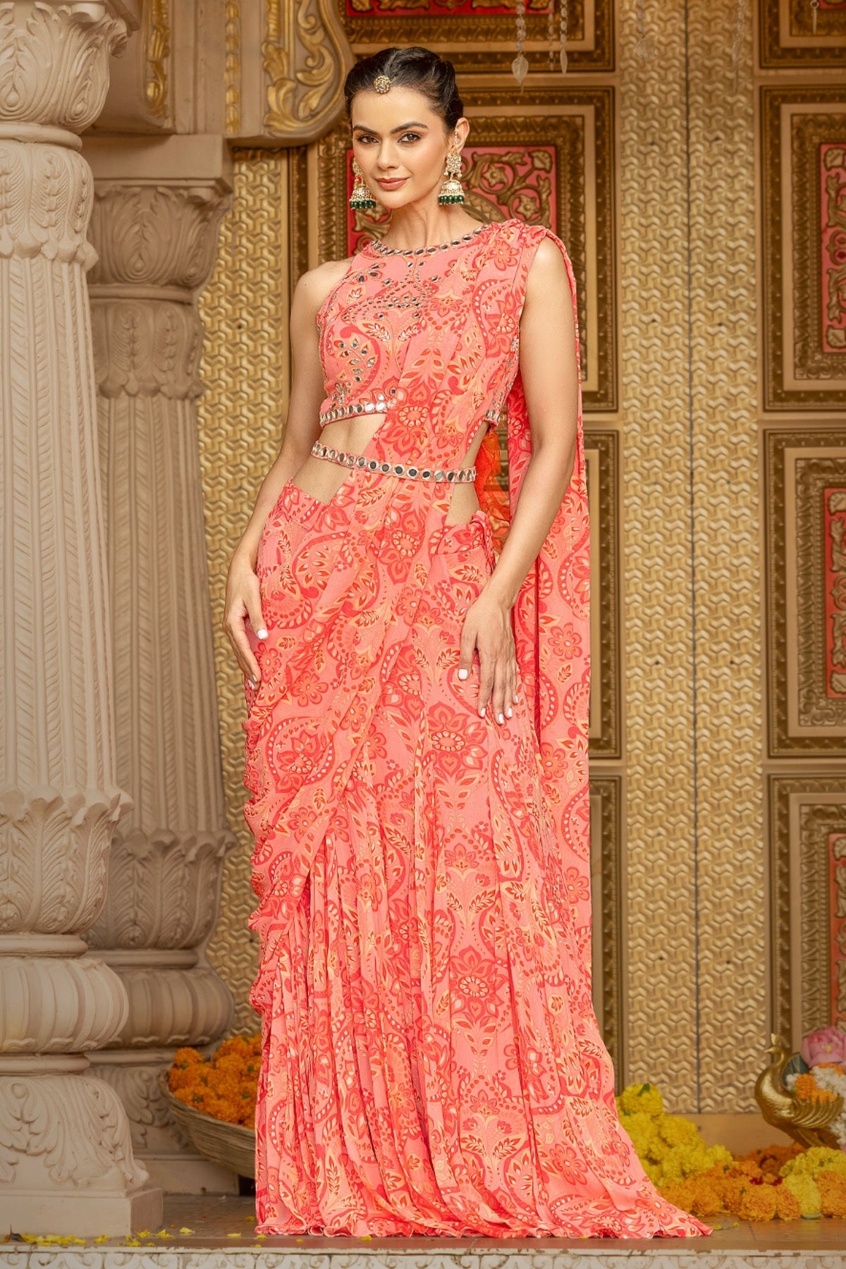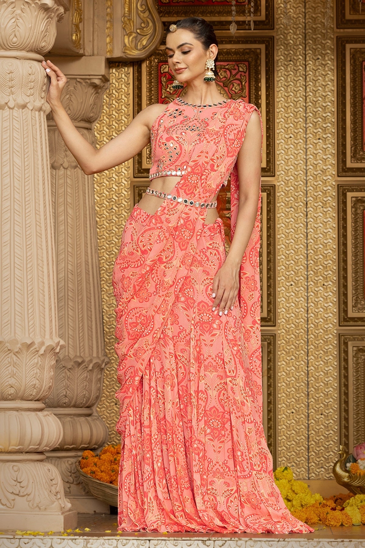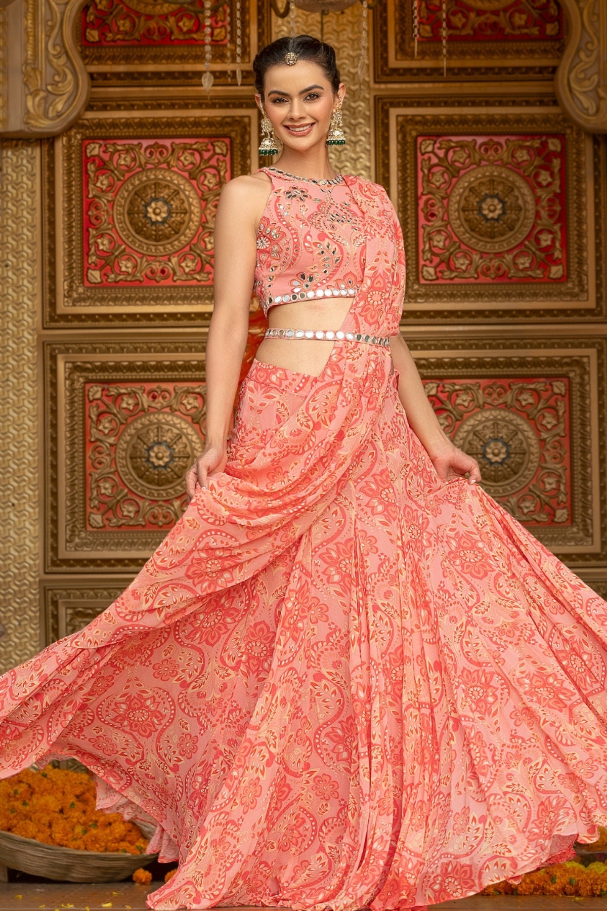 Description: In a romantic rose hue, this printed georgette halter-neck blouse is elevated with all-over hand-embroidered mirror work, catching every glimmer of light like it was made for celebration. Paired with a flowy, coordinated printed georgette lehenga featuring an attached pallu, this ensemble blends boldness with movement—crafted for brides who turn tradition on its head and dance through chaos with grace. Perfect for the ones who thrive in color, sparkle, and the glorious unpredictability of Indian weddings.