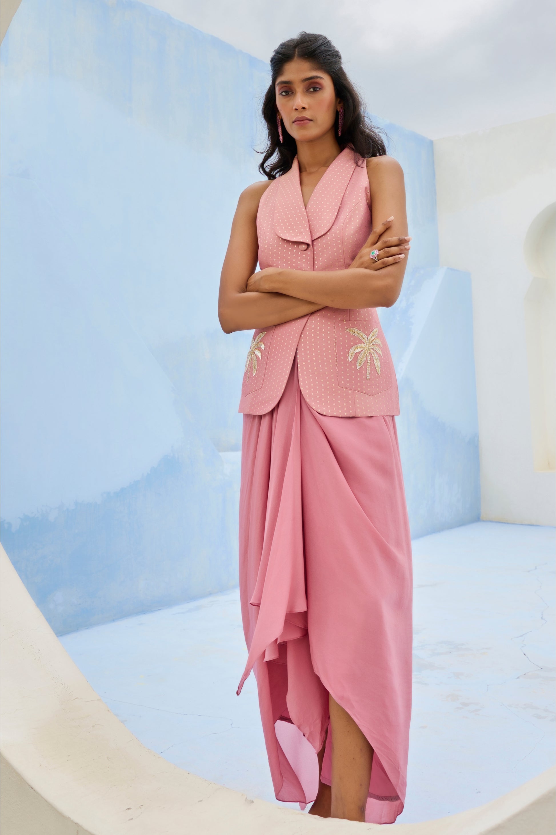 Crepe drape skirt paired with tissue silk polka woven blazer with zardozi embroidered detailing on pockets