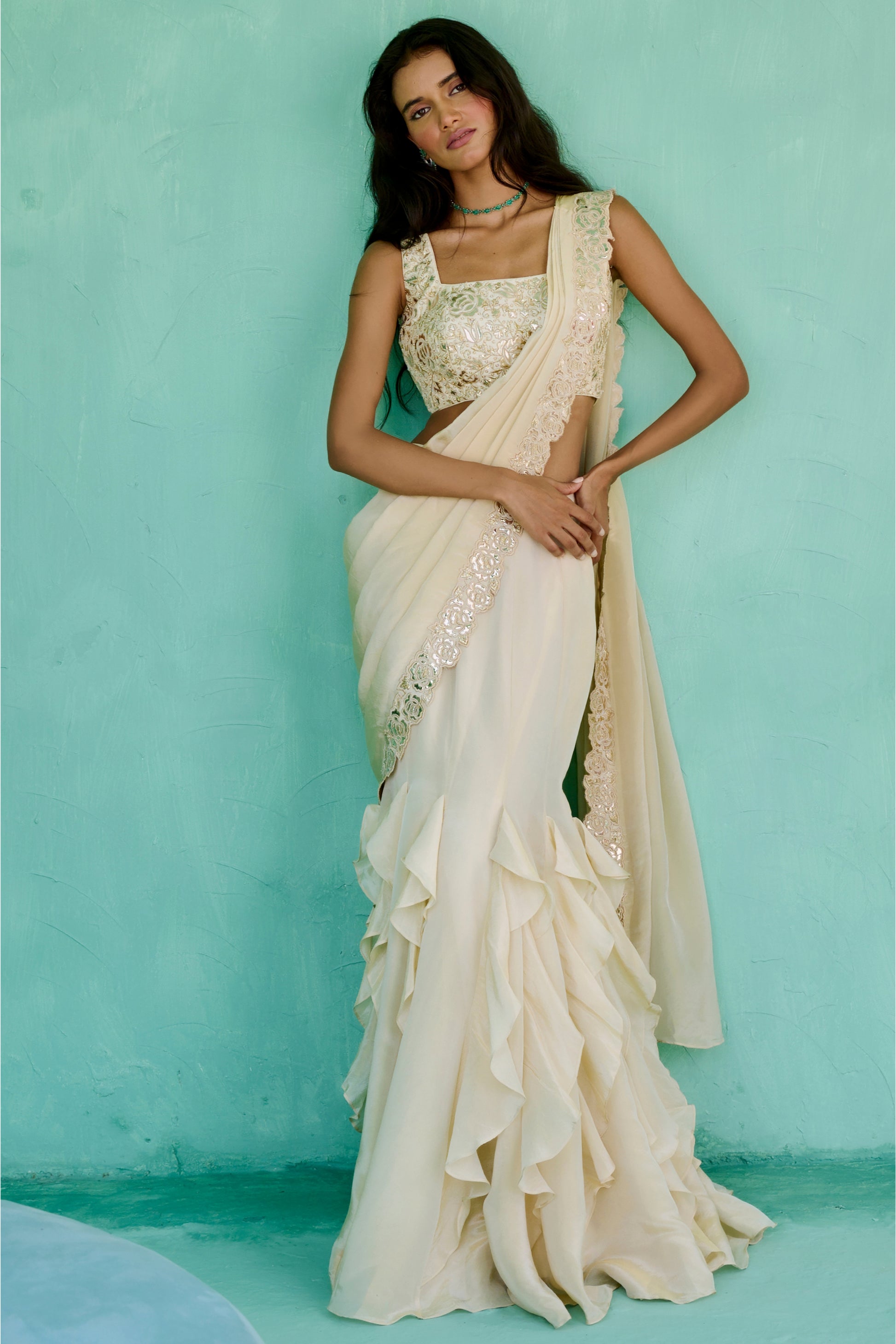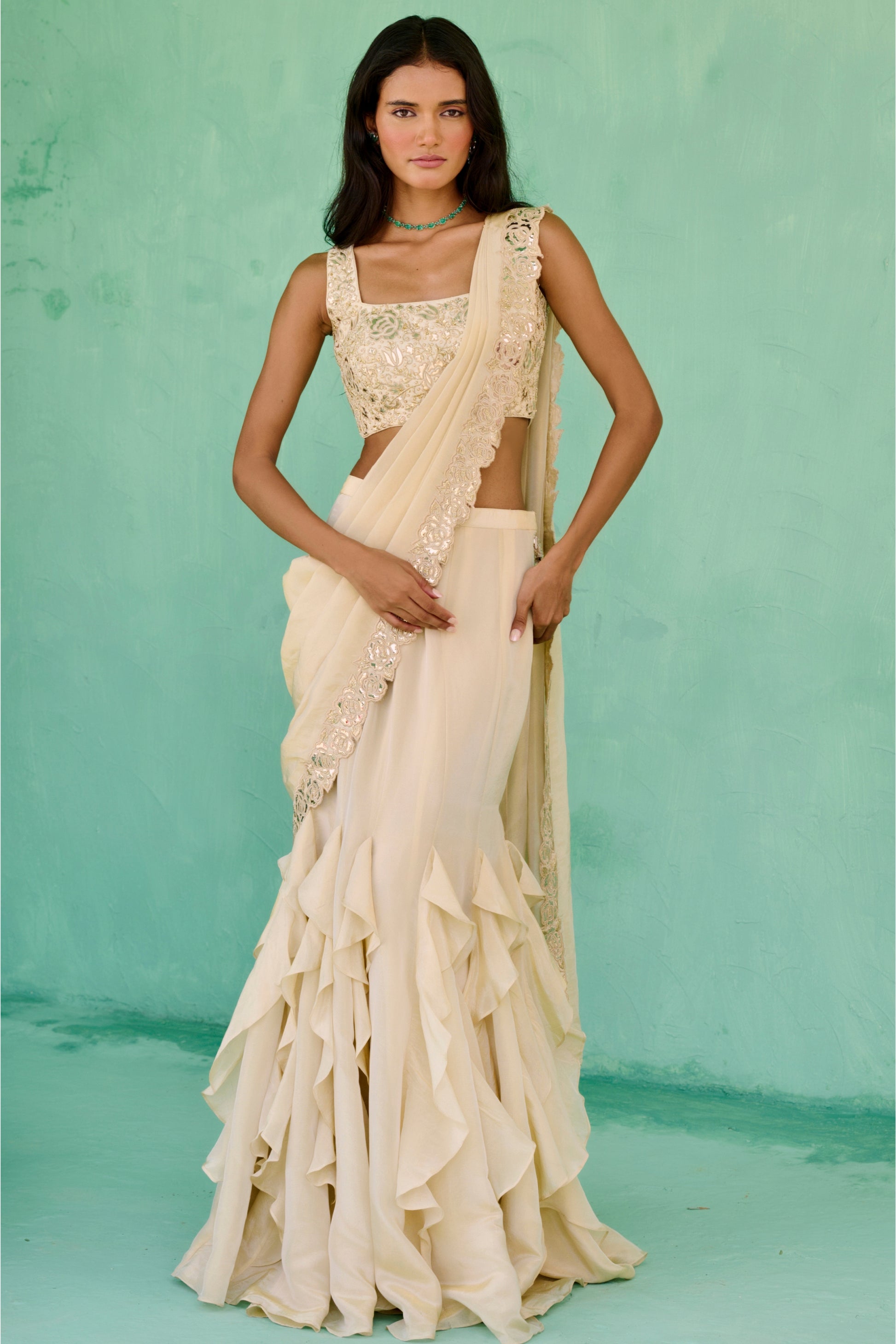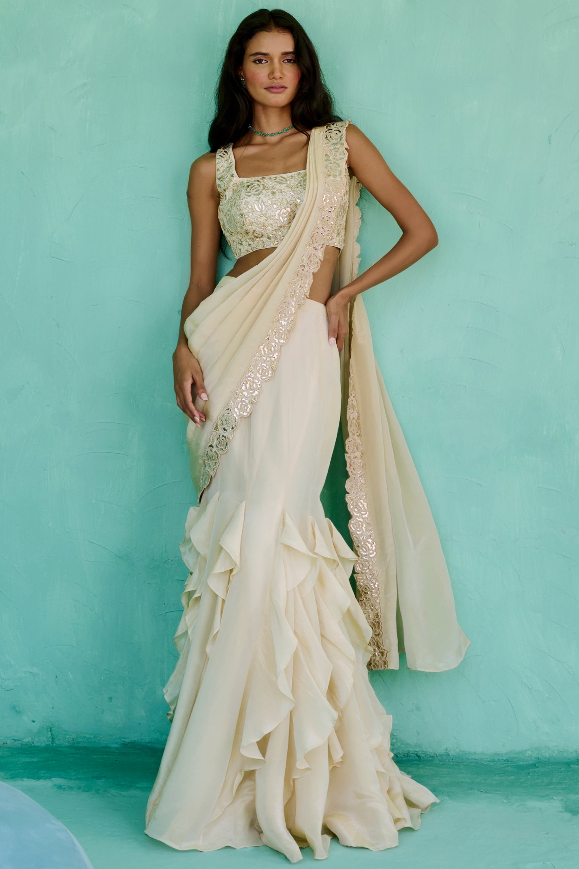 Tissue cascade pre-drape saree with faux metallic leather border paired with thread, zari , pearl and faux metallic leather embroidered blouse